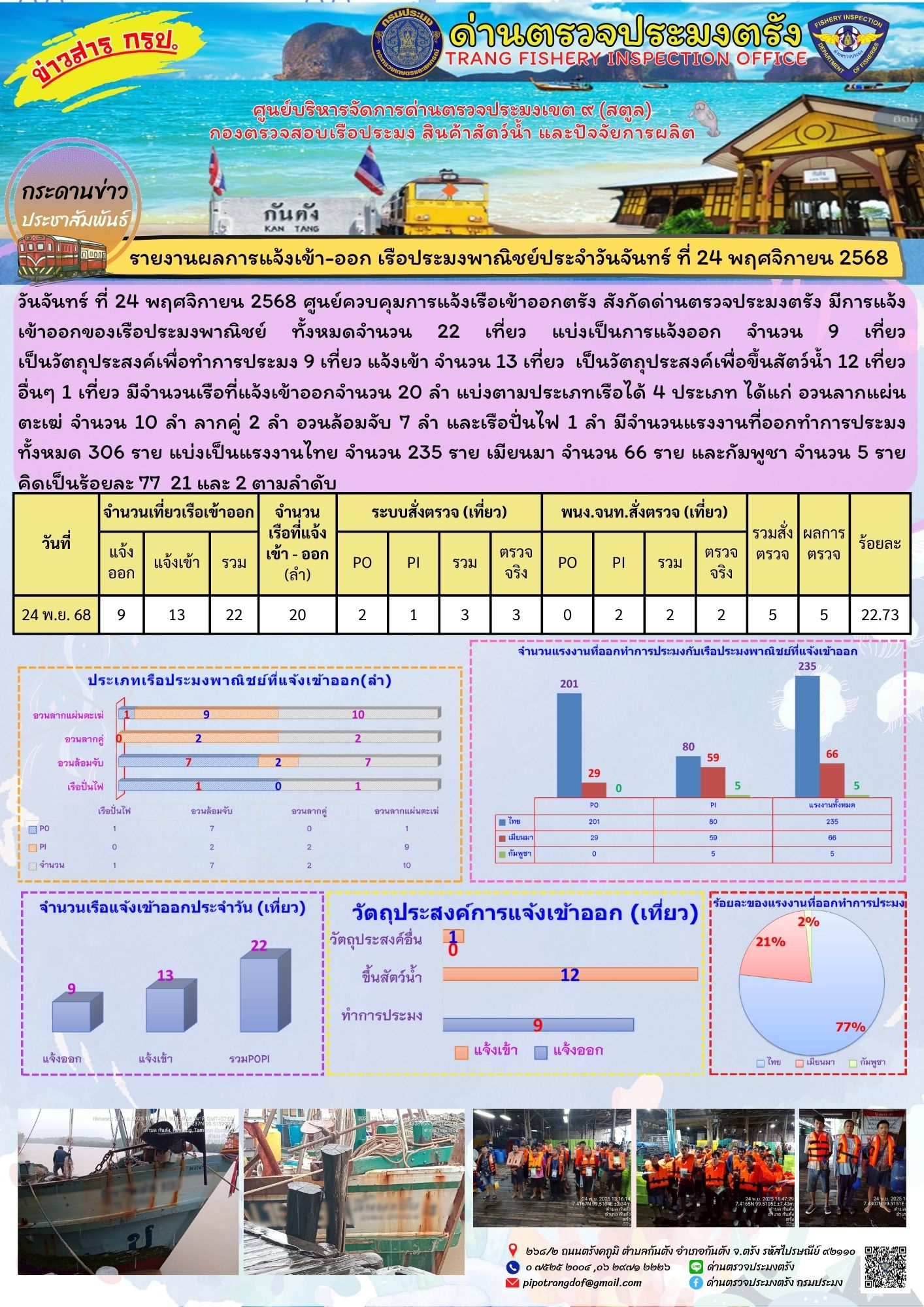 วันจันทร์ ที่ 24 พฤศจิกายน 2568 ศูนย์ควบคุมการแจ้งเรือเข้าออกตรัง สังกัดด่านตรวจประมงตรัง มีการแจ้งเข้าออกของเรือประมงพาณิชย์ ทั้งหมดจำนวน 22 เที่ยว แบ่งเป็นการแจ้งออก จำนวน 9 เที่ยว เป็นวัตถุประสงค์เพื่อทำการประมง 9 เที่ยว แจ้งเข้า จำนวน 13 เที่ยว  เป็นวัตถุประสงค์เพื่อขึ้นสัตว์น้ำ 12 เที่ยว อื่นๆ 1 เที่ยว มีจำนวนเรือที่แจ้งเข้าออกจำนวน 20 ลำ แบ่งตามประเภทเรือได้ 4 ประเภท ได้แก่ อวนลากแผ่นตะเฆ่ จำนวน 10 ลำ ลากคู่ 2 ลำ อวนล้อมจับ 7 ลำ และเรือปั่นไฟ 1 ลำ มีจำนวนแรงงานที่ออกทำการประมงทั้งหมด 306 ราย แบ่งเป็นแรงงานไทย จำนวน 235 ราย เมียนมา จำนวน 66 ราย และกัมพูชา จำนวน 5 ราย คิดเป็นร้อยละ 77  21 และ 2 ตามลำดับ