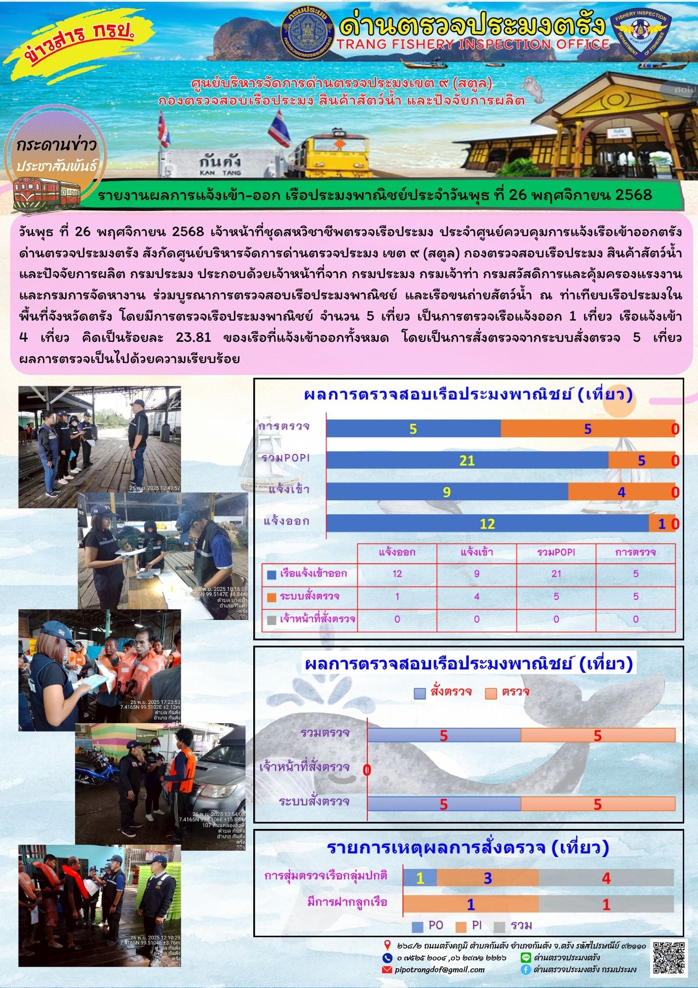NEW #ผลการแจ้งเข้าออกและการตรวจสอบเรือประมงประจำวันที่ 26 พฤศจิกายน 2568..คลิก