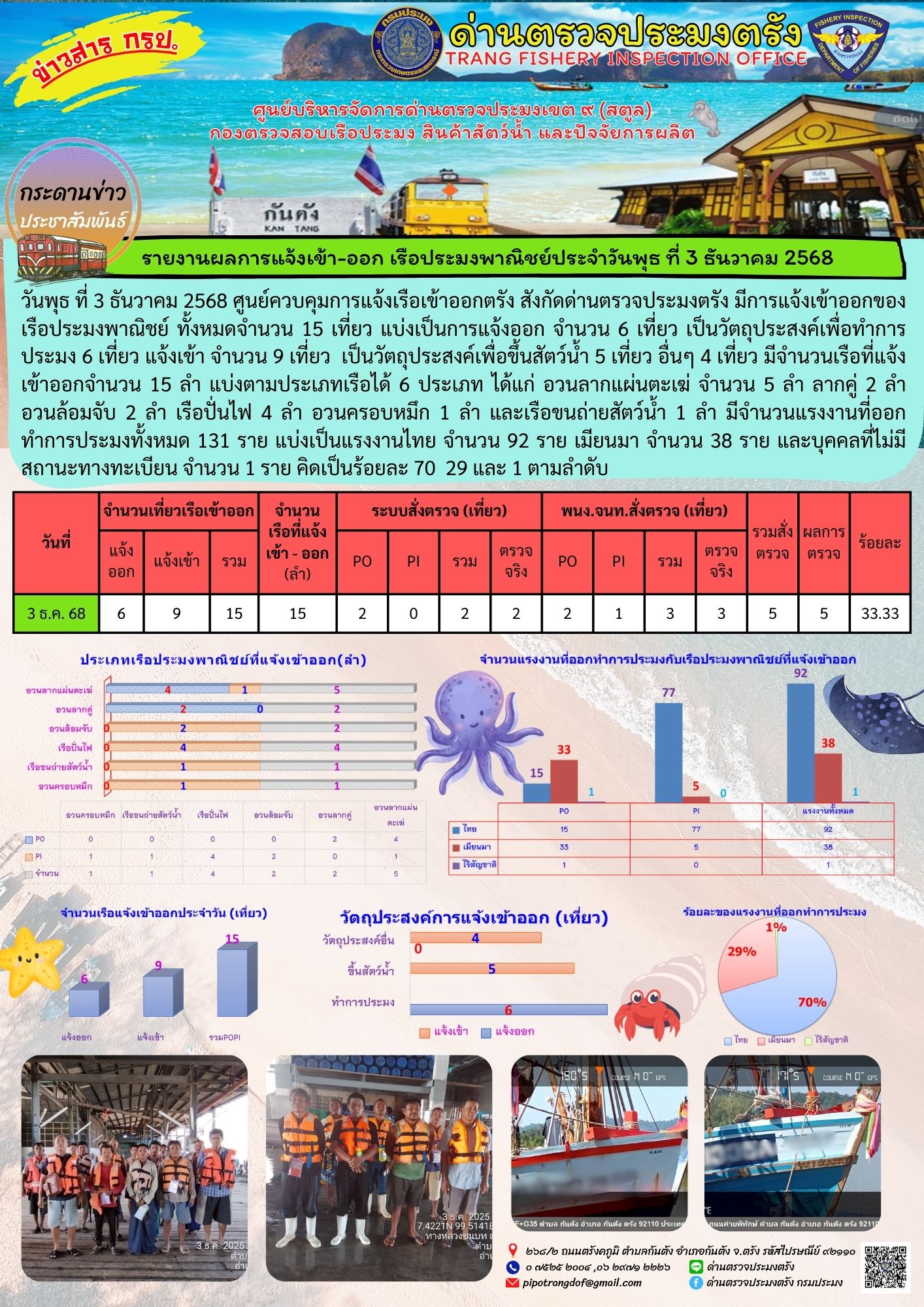 วันพุธ ที่ 3 ธันวาคม 2568 ศูนย์ควบคุมการแจ้งเรือเข้าออกตรัง สังกัดด่านตรวจประมงตรัง มีการแจ้งเข้าออกของเรือประมงพาณิชย์ ทั้งหมดจำนวน 15 เที่ยว แบ่งเป็นการแจ้งออก จำนวน 6 เที่ยว เป็นวัตถุประสงค์เพื่อทำการประมง 6 เที่ยว แจ้งเข้า จำนวน 9 เที่ยว  เป็นวัตถุประสงค์เพื่อขึ้นสัตว์น้ำ 5 เที่ยว อื่นๆ 4 เที่ยว มีจำนวนเรือที่แจ้งเข้าออกจำนวน 15 ลำ แบ่งตามประเภทเรือได้ 6 ประเภท ได้แก่ อวนลากแผ่นตะเฆ่ จำนวน 5 ลำ ลากคู่ 2 ลำ อวนล้อมจับ 2 ลำ เรือปั่นไฟ 4 ลำ อวนครอบหมึก 1 ลำ และเรือขนถ่ายสัตว์น้ำ 1 ลำ มีจำนวนแรงงานที่ออกทำการประมงทั้งหมด 131 ราย แบ่งเป็นแรงงานไทย จำนวน 92 ราย เมียนมา จำนวน 38 ราย และบุคคลที่ไม่มีสถานะทางทะเบียน จำนวน 1 ราย คิดเป็นร้อยละ 70  29 และ 1 ตามลำดับ