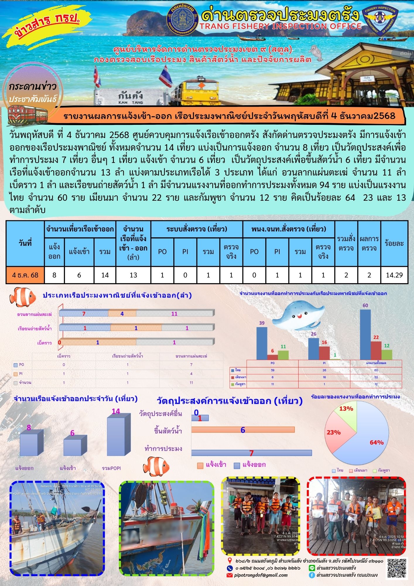 วันพฤหัสบดี ที่ 4 ธันวาคม 2568 ศูนย์ควบคุมการแจ้งเรือเข้าออกตรัง สังกัดด่านตรวจประมงตรัง มีการแจ้งเข้าออกของเรือประมงพาณิชย์ ทั้งหมดจำนวน 14 เที่ยว แบ่งเป็นการแจ้งออก จำนวน 8 เที่ยว เป็นวัตถุประสงค์เพื่อทำการประมง 7 เที่ยว อื่นๆ 1 เที่ยว แจ้งเข้า จำนวน 6 เที่ยว  เป็นวัตถุประสงค์เพื่อขึ้นสัตว์น้ำ 6 เที่ยว มีจำนวนเรือที่แจ้งเข้าออกจำนวน 13 ลำ แบ่งตามประเภทเรือได้ 3 ประเภท ได้แก่ อวนลากแผ่นตะเฆ่ จำนวน 11 ลำ เบ็ดราว 1 ลำ และเรือขนถ่ายสัตว์น้ำ 1 ลำ มีจำนวนแรงงานที่ออกทำการประมงทั้งหมด 94 ราย แบ่งเป็นแรงงานไทย จำนวน 60 ราย เมียนมา จำนวน 22 ราย และกัมพูชา จำนวน 12 ราย คิดเป็นร้อยละ 64  23 และ 13 ตามลำดับ