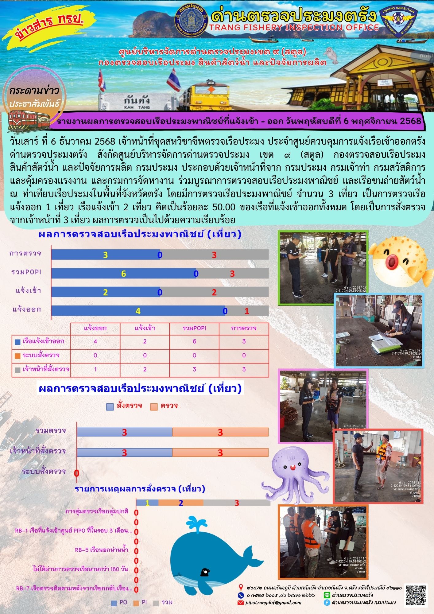 วันเสาร์ ที่ 6 ธันวาคม 2568 เจ้าหน้าที่ชุดสหวิชาชีพตรวจเรือประมง ประจำศูนย์ควบคุมการแจ้งเรือเข้าออกตรัง ด่านตรวจประมงตรัง สังกัดศูนย์บริหารจัดการด่านตรวจประมง เขต ๙ (สตูล) กองตรวจสอบเรือประมง สินค้าสัตว์น้ำ และปัจจัยการผลิต กรมประมง ประกอบด้วยเจ้าหน้าที่จาก กรมประมง กรมเจ้าท่า กรมสวัสดิการและคุ้มครองแรงงาน และกรมการจัดหางาน ร่วมบูรณาการตรวจสอบเรือประมงพาณิชย์ และเรือขนถ่ายสัตว์น้ำ ณ ท่าเทียบเรือประมงในพื้นที่จังหวัดตรัง โดยมีการตรวจเรือประมงพาณิชย์ จำนวน 3 เที่ยว เป็นการตรวจเรือแจ้งออก 1 เที่ยว เรือแจ้งเข้า 2 เที่ยว คิดเป็นร้อยละ 50.00 ของเรือที่แจ้งเข้าออกทั้งหมด โดยเป็นการสั่งตรวจจากเจ้าหน้าที่ 3 เที่ยว ผลการตรวจเป็นไปด้วยความเรียบร้อย
