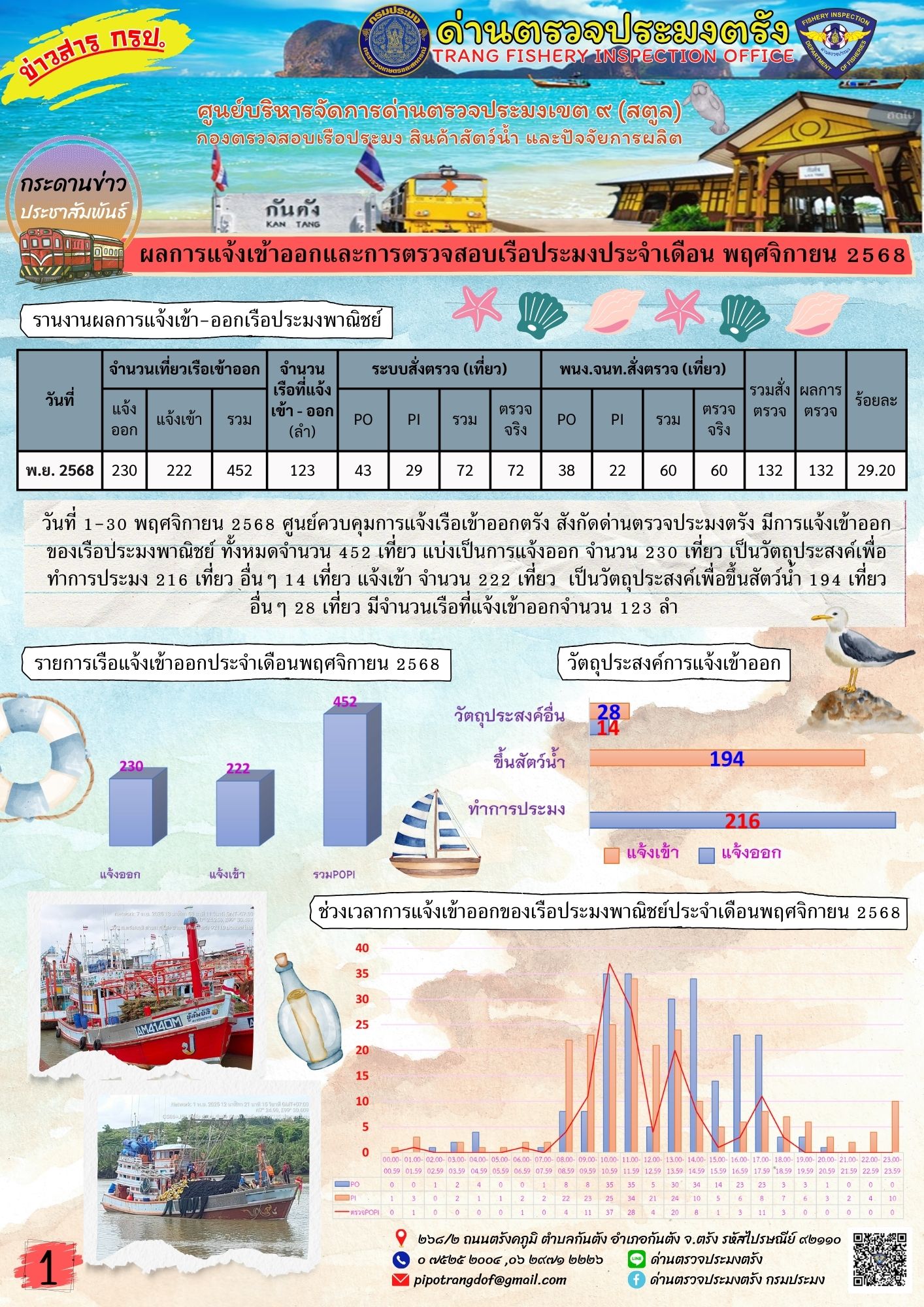 วันที่ 1-30 พฤศจิกายน 2568 ศูนย์ควบคุมการแจ้งเรือเข้าออกตรัง สังกัดด่านตรวจประมงตรัง มีการแจ้งเข้าออกของเรือประมงพาณิชย์ ทั้งหมดจำนวน 452 เที่ยว แบ่งเป็นการแจ้งออก จำนวน 230 เที่ยว เป็นวัตถุประสงค์เพื่อทำการประมง 216 เที่ยว อื่นๆ 14 เที่ยว แจ้งเข้า จำนวน 222 เที่ยว  เป็นวัตถุประสงค์เพื่อขึ้นสัตว์น้ำ 194 เที่ยว อื่นๆ 28 เที่ยว มีจำนวนเรือที่แจ้งเข้าออกจำนวน 123 ลำ