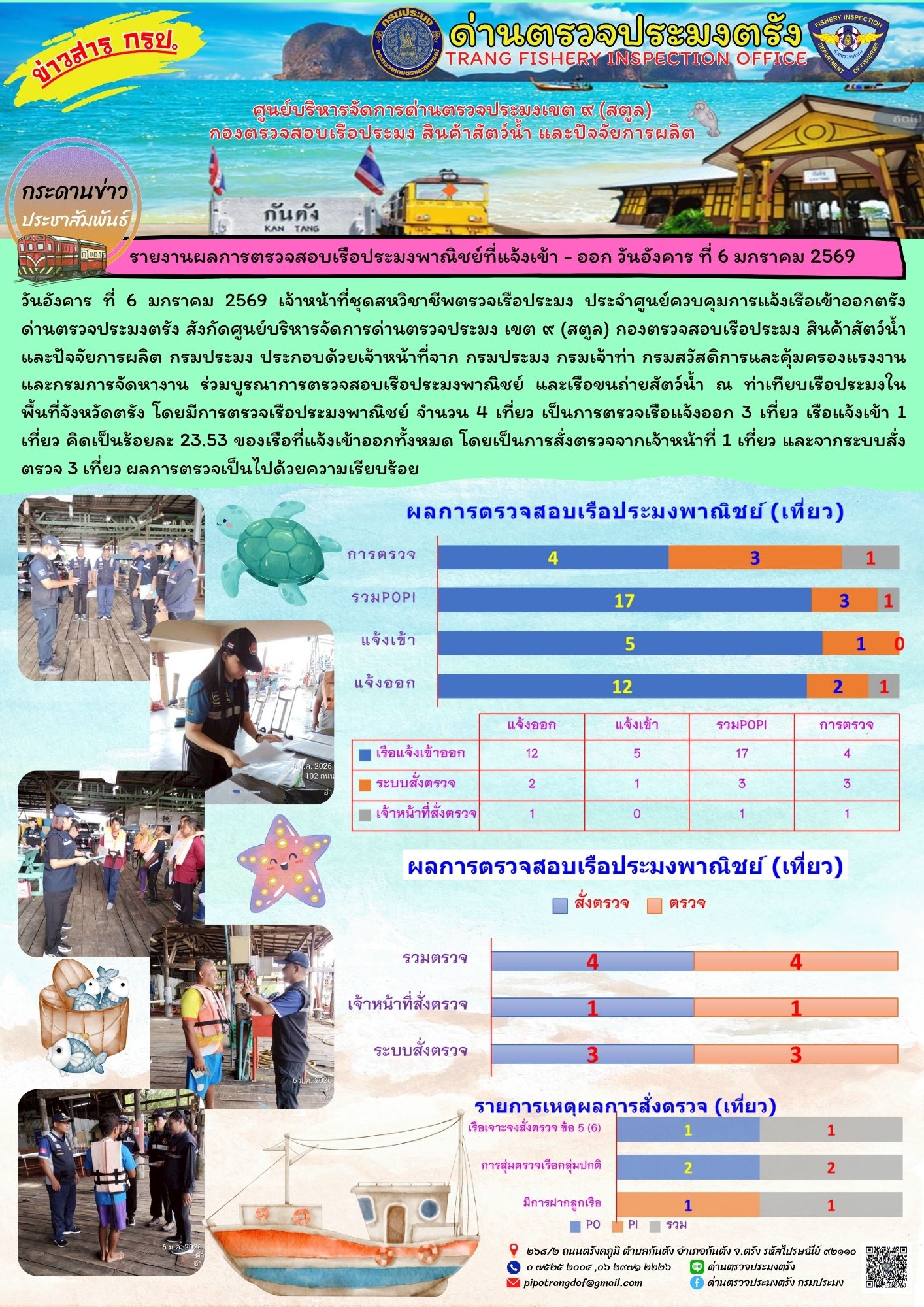 วันอังคาร ที่ 6 มกราคม 2569 เจ้าหน้าที่ชุดสหวิชาชีพตรวจเรือประมง ประจำศูนย์ควบคุมการแจ้งเรือเข้าออกตรัง ด่านตรวจประมงตรัง สังกัดศูนย์บริหารจัดการด่านตรวจประมง เขต ๙ (สตูล) กองตรวจสอบเรือประมง สินค้าสัตว์น้ำ และปัจจัยการผลิต กรมประมง ประกอบด้วยเจ้าหน้าที่จาก กรมประมง กรมเจ้าท่า กรมสวัสดิการและคุ้มครองแรงงาน และกรมการจัดหางาน ร่วมบูรณาการตรวจสอบเรือประมงพาณิชย์ และเรือขนถ่ายสัตว์น้ำ ณ ท่าเทียบเรือประมงในพื้นที่จังหวัดตรัง โดยมีการตรวจเรือประมงพาณิชย์ จำนวน 4 เที่ยว เป็นการตรวจเรือแจ้งออก 3 เที่ยว เรือแจ้งเข้า 1 เที่ยว คิดเป็นร้อยละ 23.53 ของเรือที่แจ้งเข้าออกทั้งหมด โดยเป็นการสั่งตรวจจากเจ้าหน้าที่ 1 เที่ยว และจากระบบสั่งตรวจ 3 เที่ยว ผลการตรวจเป็นไปด้วยความเรียบร้อย