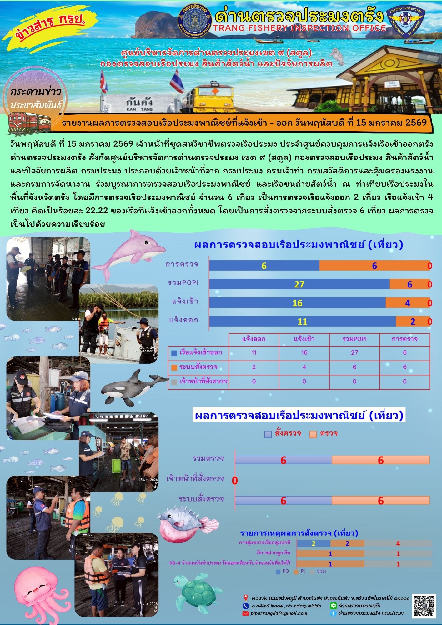 วันพฤหัสบดี ที่ 15 มกราคม 2569 เจ้าหน้าที่ชุดสหวิชาชีพตรวจเรือประมง ประจำศูนย์ควบคุมการแจ้งเรือเข้าออกตรัง ด่านตรวจประมงตรัง สังกัดศูนย์บริหารจัดการด่านตรวจประมง เขต ๙ (สตูล) กองตรวจสอบเรือประมง สินค้าสัตว์น้ำ และปัจจัยการผลิต กรมประมง ประกอบด้วยเจ้าหน้าที่จาก กรมประมง กรมเจ้าท่า กรมสวัสดิการและคุ้มครองแรงงาน และกรมการจัดหางาน ร่วมบูรณาการตรวจสอบเรือประมงพาณิชย์ และเรือขนถ่ายสัตว์น้ำ ณ ท่าเทียบเรือประมงในพื้นที่จังหวัดตรัง โดยมีการตรวจเรือประมงพาณิชย์ จำนวน 6 เที่ยว เป็นการตรวจเรือแจ้งออก 2 เที่ยว เรือแจ้งเข้า 4 เที่ยว คิดเป็นร้อยละ 22.22 ของเรือที่แจ้งเข้าออกทั้งหมด โดยเป็นการสั่งตรวจจากระบบสั่งตรวจ 6 เที่ยว ผลการตรวจเป็นไปด้วยความเรียบร้อย