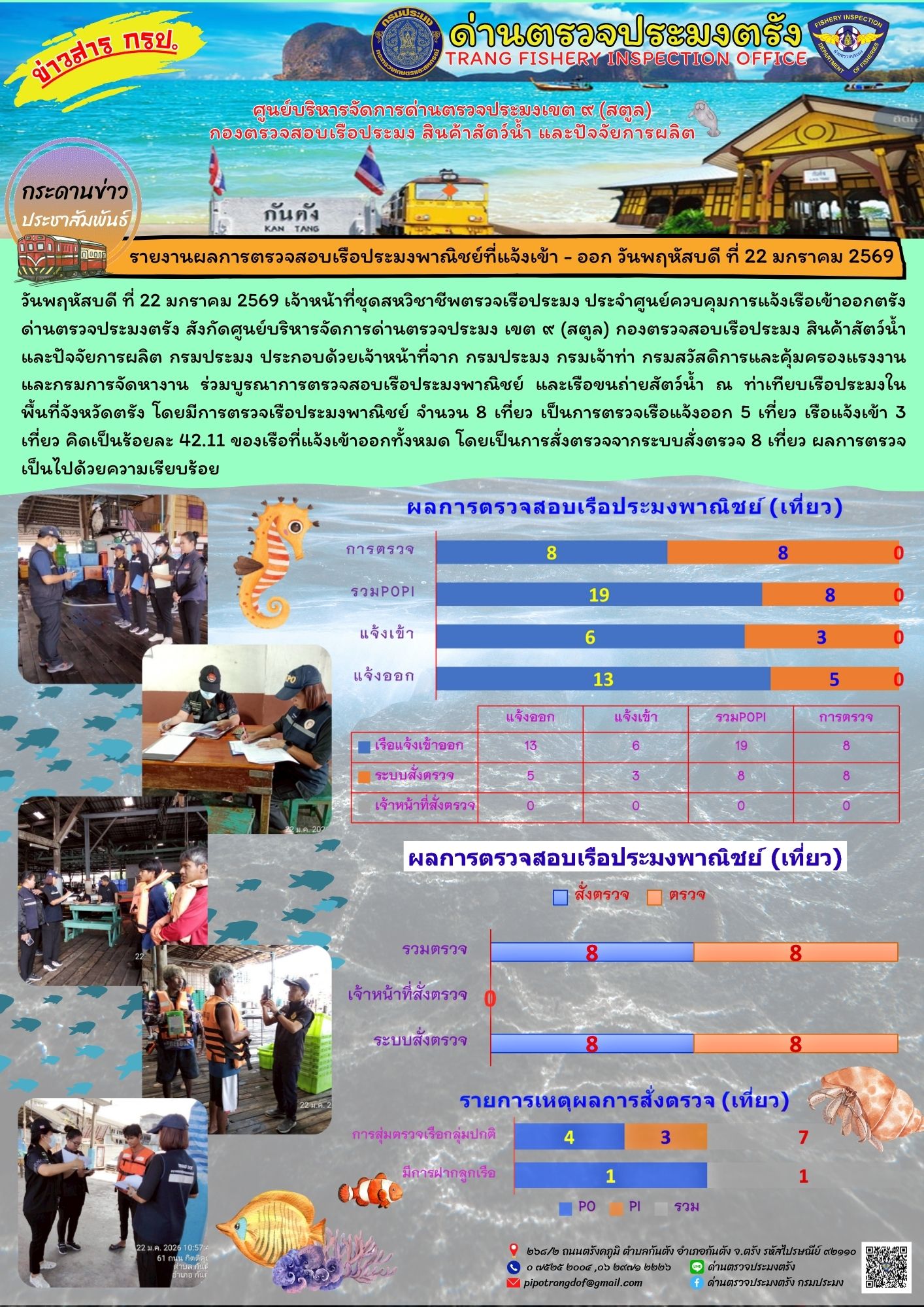 วันพฤหัสบดี ที่ 22 มกราคม 2569 เจ้าหน้าที่ชุดสหวิชาชีพตรวจเรือประมง ประจำศูนย์ควบคุมการแจ้งเรือเข้าออกตรัง ด่านตรวจประมงตรัง สังกัดศูนย์บริหารจัดการด่านตรวจประมง เขต ๙ (สตูล) กองตรวจสอบเรือประมง สินค้าสัตว์น้ำ และปัจจัยการผลิต กรมประมง ประกอบด้วยเจ้าหน้าที่จาก กรมประมง กรมเจ้าท่า กรมสวัสดิการและคุ้มครองแรงงาน และกรมการจัดหางาน ร่วมบูรณาการตรวจสอบเรือประมงพาณิชย์ และเรือขนถ่ายสัตว์น้ำ ณ ท่าเทียบเรือประมงในพื้นที่จังหวัดตรัง โดยมีการตรวจเรือประมงพาณิชย์ จำนวน 8 เที่ยว เป็นการตรวจเรือแจ้งออก 5 เที่ยว เรือแจ้งเข้า 3 เที่ยว คิดเป็นร้อยละ 42.11 ของเรือที่แจ้งเข้าออกทั้งหมด โดยเป็นการสั่งตรวจจากระบบสั่งตรวจ 8 เที่ยว ผลการตรวจเป็นไปด้วยความเรียบร้อย