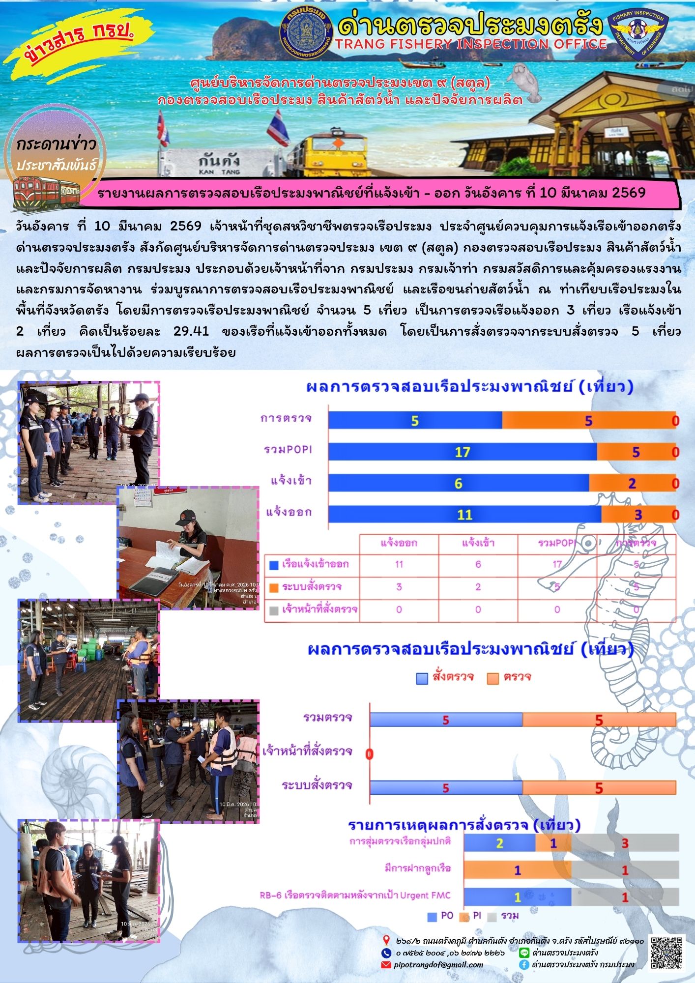วันอังคาร ที่ 10 มีนาคม 2569 เจ้าหน้าที่ชุดสหวิชาชีพตรวจเรือประมง ประจำศูนย์ควบคุมการแจ้งเรือเข้าออกตรัง ด่านตรวจประมงตรัง สังกัดศูนย์บริหารจัดการด่านตรวจประมง เขต ๙ (สตูล) กองตรวจสอบเรือประมง สินค้าสัตว์น้ำ และปัจจัยการผลิต กรมประมง ประกอบด้วยเจ้าหน้าที่จาก กรมประมง กรมเจ้าท่า กรมสวัสดิการและคุ้มครองแรงงาน และกรมการจัดหางาน ร่วมบูรณาการตรวจสอบเรือประมงพาณิชย์ และเรือขนถ่ายสัตว์น้ำ ณ ท่าเทียบเรือประมงในพื้นที่จังหวัดตรัง โดยมีการตรวจเรือประมงพาณิชย์ จำนวน 5 เที่ยว เป็นการตรวจเรือแจ้งออก 3 เที่ยว เรือแจ้งเข้า 2 เที่ยว คิดเป็นร้อยละ 29.41 ของเรือที่แจ้งเข้าออกทั้งหมด โดยเป็นการสั่งตรวจจากระบบสั่งตรวจ 5 เที่ยว ผลการตรวจเป็นไปด้วยความเรียบร้อย