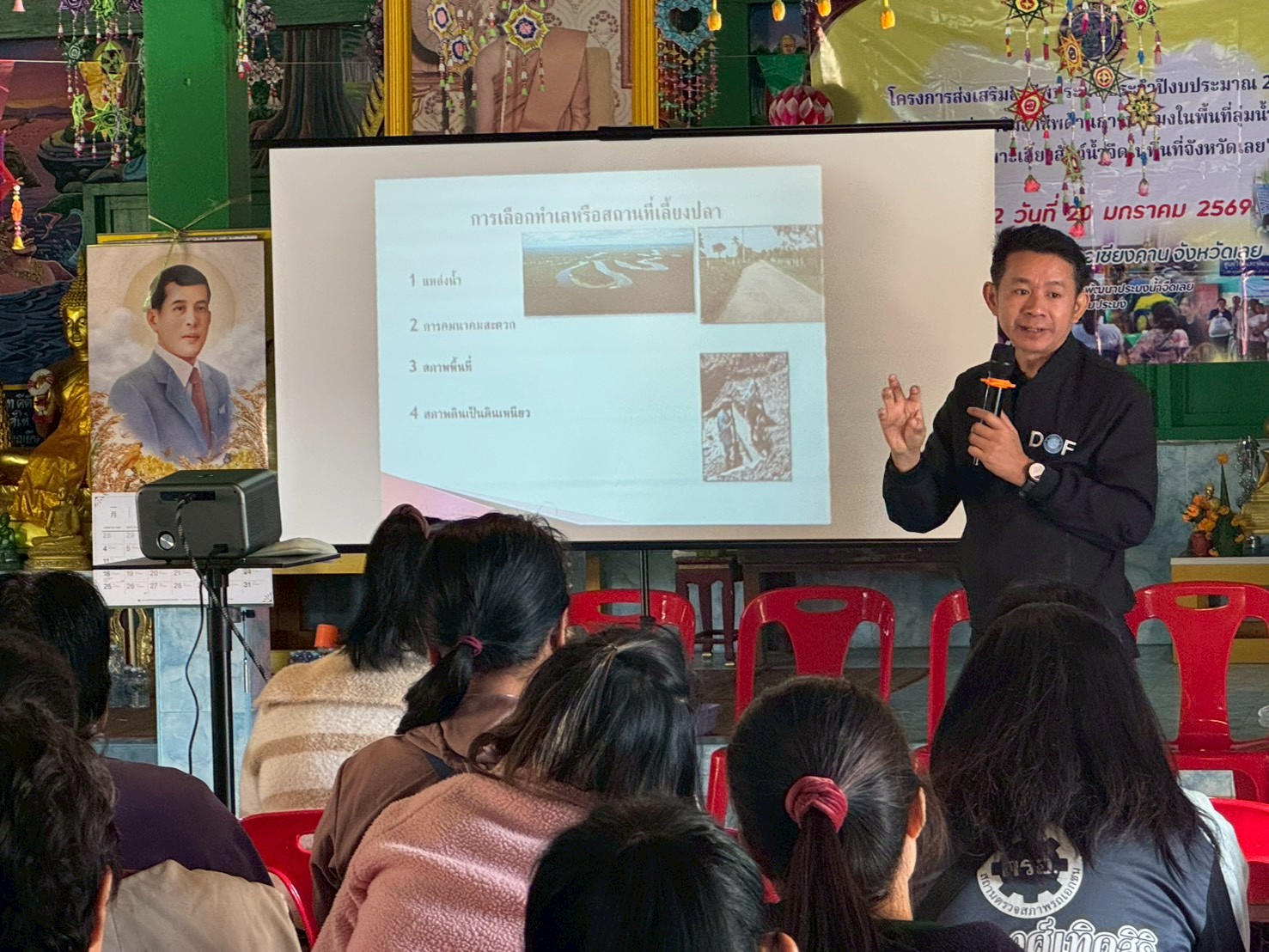 วันที่ 19 - 20 มกราคม 2569 ศูนย์วิจัยและพัฒนาประมงน้ำจืดเลย ร่วมกับสำนักงานประมงจังหวัดเลย ดำเนินงานโครงการส่งเสริมอาชีพประมง กิจกรรมส่งเสริมและบริหารจัดการทรัพยากรประมงในพื้นที่ลุ่มน้ำพรมแดน ประจำปีงบประมาณ 2569 โดยจัดอบรมให้แก่เกษตรกรพื้นที่อำเภอเชียงคาน จังหวัดเลย หลักสูตรส่งเสริมอาชีพด้านการประมงในพื้นที่ลุ่มน้ำพรมแดนด้านการเพาะเลี้ยงสัตว์น้ำจืด จำนวน 2 รุ่น รุ่นละ 50 ราย ณ ห้องประชุมศูนย์วิจัยและพัฒนาประมงน้ำจืดเลย และวัดศรีชมชื่น อำเภอเชียงคาน จังหวัดเลย