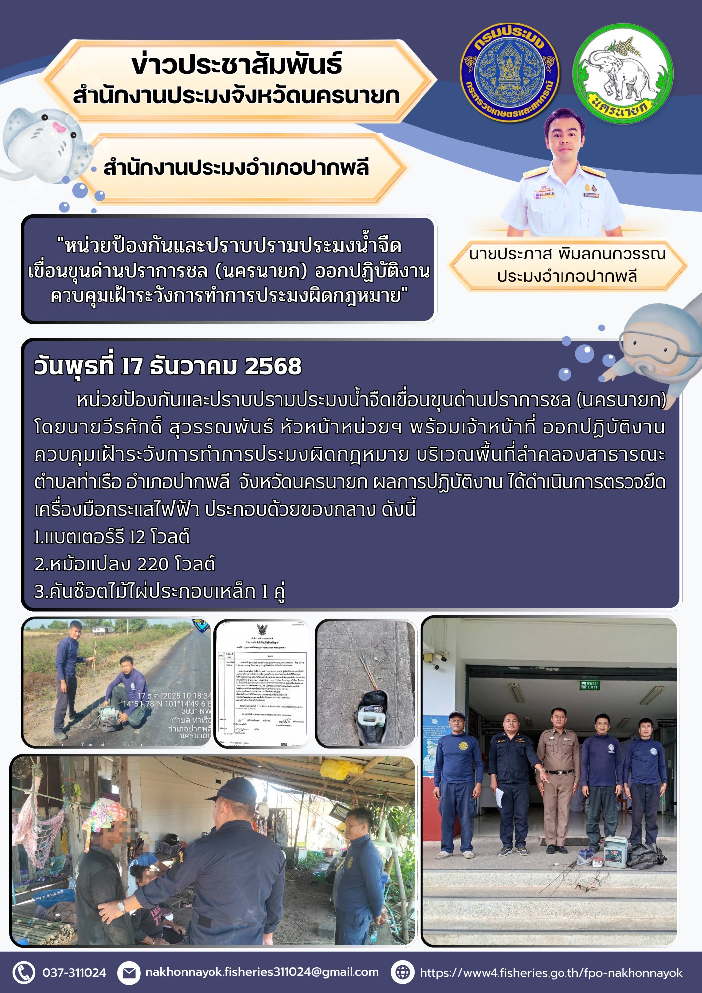 "หน่วยป้องกันและปราบปรามประมงน้ำจืดเขื่อนขุนด่านปราการชล (นครนายก) ออกปฏิบัติงานควบคุมเฝ้าระวังการทำการประมงผิดกฎหมาย"