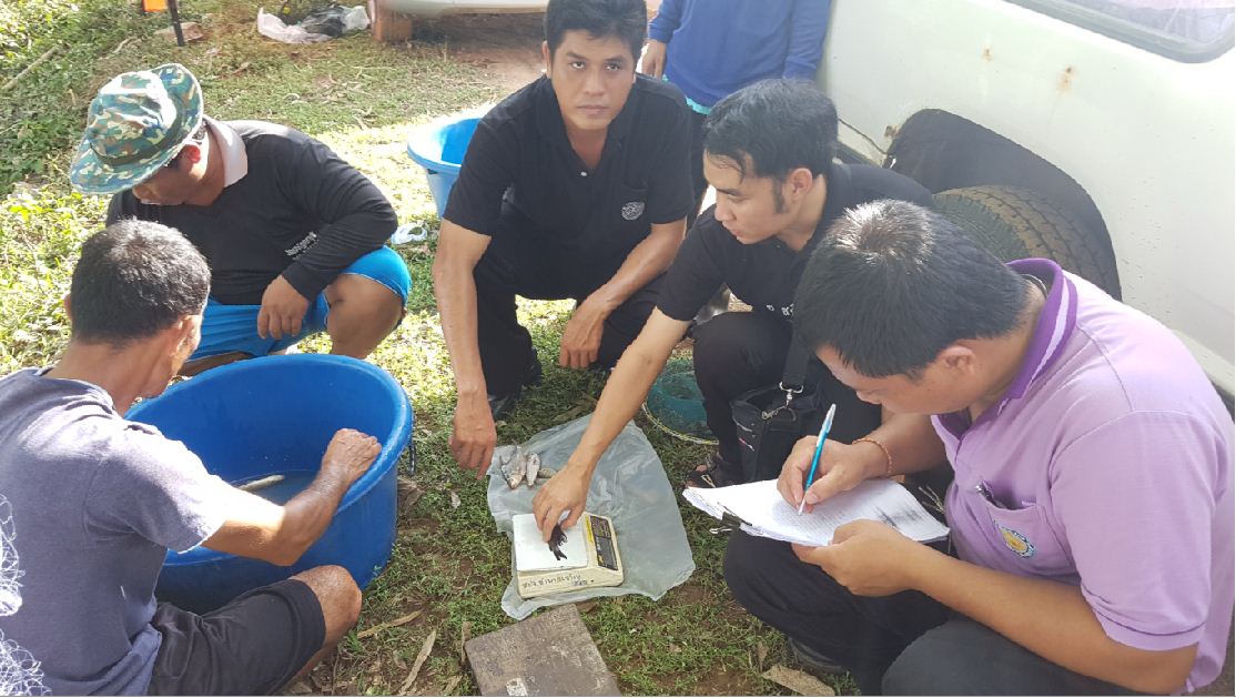 ศูนย์วิจัยและพัฒนาการเพาะเลี้ยงสัตว์น้ำจืดอำนาจเจริญร่วมกับสำนักงานประมงจังหวัดอำนาจเจริญ และ คณะกรรมการดำเนินงานโครงการธนาคารผลผลิตเกษตรด้านการประมงบ้านฟ้าห่วนและบ้านนาอุดม ร่วมทำการสุ่มตัวอย่าง