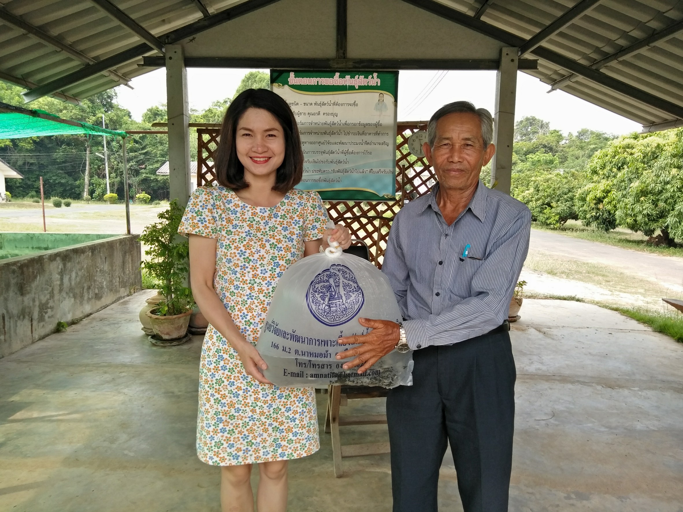 วันที่ 25 เมษายน 2561 นางสาวธิติยดา  วรสาร เจ้าพนักงานธุรการปฏิบัติงาน ศูนย์วิจัยและพัฒนาการเพาะเลี้ยงสัตว์น้ำจืดอำนาจเจริญ มอบการสนับสนุนพันธุ์ปลาน้ำจืด (ปลานิล
