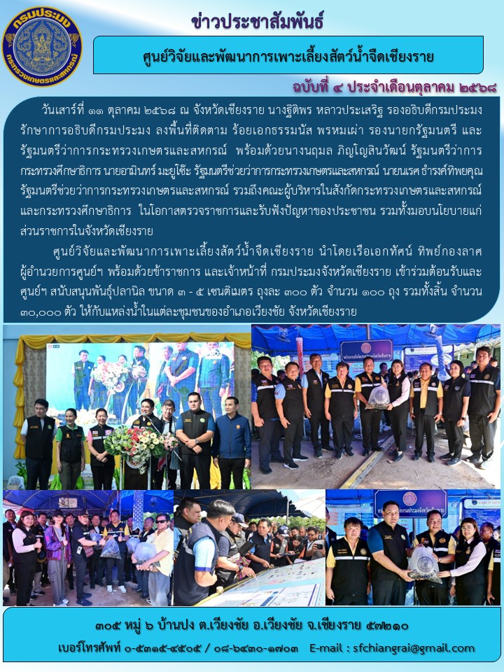 วันเสาร์ที่ 11 ตุลาคม 2568 ณ จังหวัดเชียงราย นางฐิติพร หลาวประเสริฐ รองอธิบดีกรมประมง รักษาการอธิบดีกรมประมง ลงพื้นที่ติดตาม ร้อยเอกธรรมนัส พรหมเผ่า รองนายกรัฐมนตรี และรัฐมนตรีว่าการกระทรวงเกษตรและสหกรณ์  พร้อมด้วยนางนฤมล ภิญโญสินวัฒน์ รัฐมนตรีว่าการกระทรวงศึกษาธิการ นายอามินทร์ มะยูโซ๊ะ รัฐมนตรีช่วยว่าการกระทรวงเกษตรและสหกรณ์ นายนเรศ ธำรงค์ทิพยคุณ รัฐมนตรีช่วยว่าการกระทรวงเกษตรและสหกรณ์ รวมถึงคณะผู้บริหารในสังกัดกระทรวงเกษตรและสหกรณ์และกระทรวงศึกษาธิการ  ในโอกาสตรวจราชการและรับฟังปัญหาของประชาชน รวมทั้งมอบนโยบายแก่ส่วนราชการในจังหวัดเชียงราย