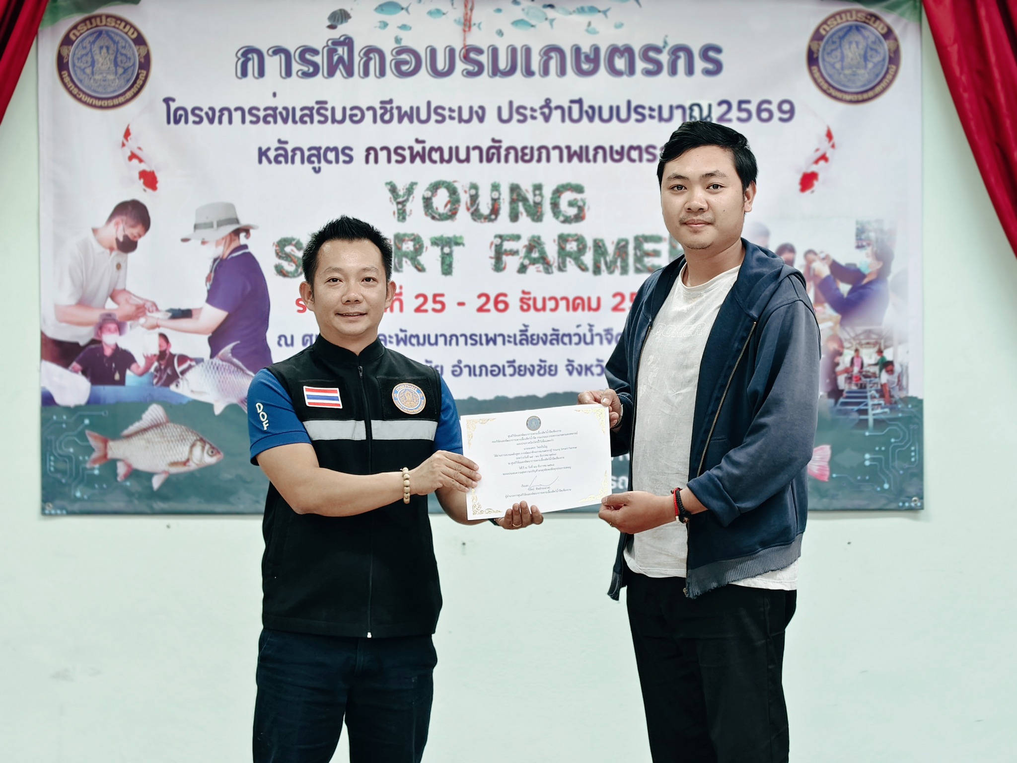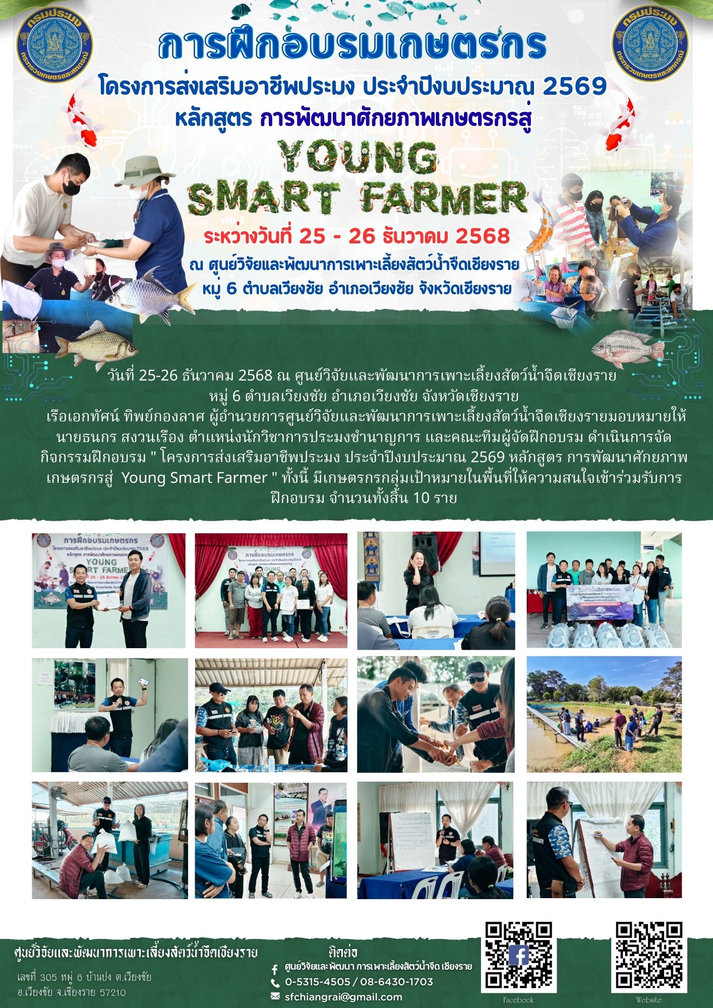 เรือเอกทัศน์ ทิพย์กองลาศ ผู้อำนวยการศูนย์วิจัยและพัฒนาการเพาะเลี้ยงสัตว์น้ำจืดเชียงรายมอบหมายให้นายธนกร สงวนเรือง ตำแหน่งนักวิชาการประมงชำนาญการ พร้อมด้วยคณะทีมผู้จัดฝึกอบรม ดำเนินการจัดกิจกรรมฝึกอบรม " โครงการส่งเสริมอาชีพประมง ประจำปีงบประมาณ 2569 หลักสูตร การพัฒนาศักยภาพเกษตรกรสู่ Young Smart Farmer " ทั้งนี้ มีเกษตรกรกลุ่มเป้าหมายในพื้นที่ให้ความสนใจเข้าร่วมรับการฝึกอบรม จำนวนทั้งสิ้น 10 ราย