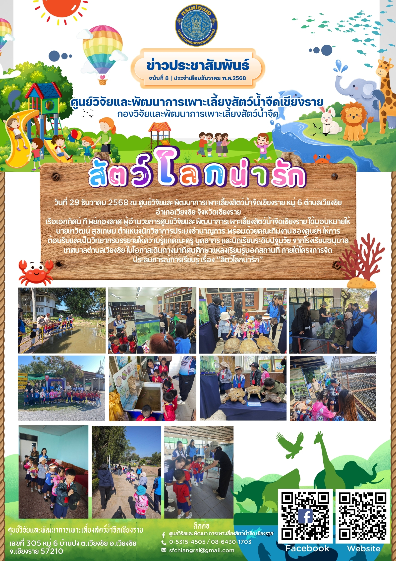 เรือเอกทัศน์ ทิพย์กองลาศ ผู้อำนวยการศูนย์วิจัยและพัฒนาการเพาะเลี้ยงสัตว์น้ำจืดเชียงราย ได้มอบหมายให้ นายเทวัฒน์ สุขเกษม ตำแหน่งนักวิชาการประมงชำนาญการ พร้อมด้วยคณะทีมงานของศูนย์ฯ ให้การต้อนรับและเป็นวิทยากรบรรยายให้ความรู้แก่นักเรียนระดับปฐมวัย จากโรงเรียนอนุบาลเทศบาลตำบลเวียงชัย ในโอกาสเดินทางมาทัศนศึกษาแหล่งเรียนรู้นอกสถานที่ ภายใต้โครงการจัดประสบการณ์การเรียนรู้ เรื่อง "สัตว์โลกน่ารัก"