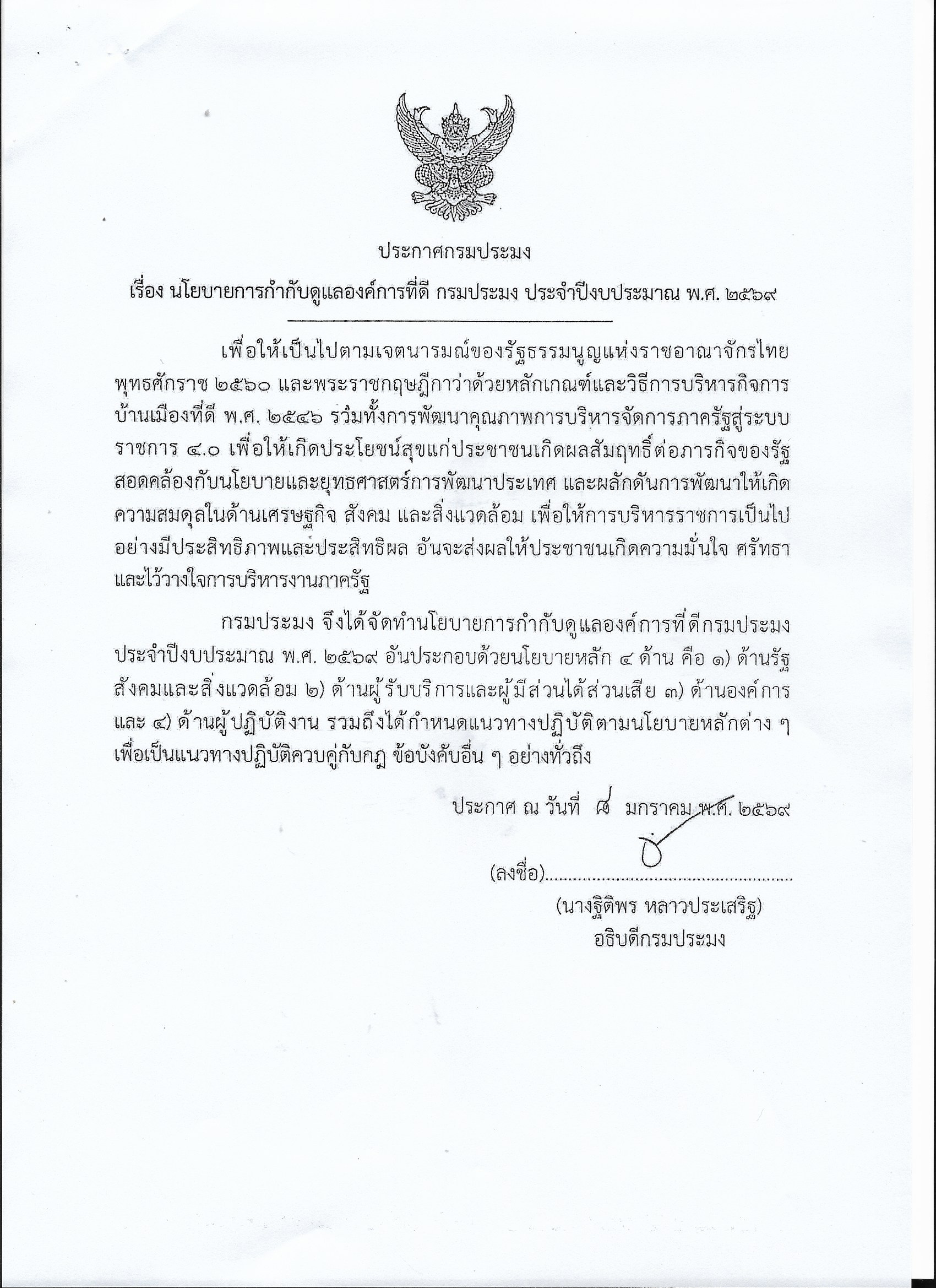 ประกาศกรมประมง เรื่อง นโยบายการกำกับดูแลองค์การที่ดี กรมประมง ประจำปีงบประมาณ พ.ศ. 2569