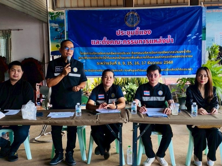 วันที่ 24 ธันวาคม 2568 นายวิชัย ทองประไพ ประมงจังหวัดสระแก้ว มอบหมายให้นายวชิราวุฒิ นาดี ประมงอำเภอวัฒนานคร พร้อมด้วยนายไชยวัฒน์ ปิจจะ เจ้าพนักงานประมงปฎิบัติงาน นางสาววิริยา ชันษา นักวิชาการประมง และนางสาวปองกานต์ ป้องกัน เจ้าพนักงานธุรการ พร้อมด้วยนางสาวจันจิลา ดีเจริญ นักวิชาการประมง ศูนย์วิจัยและพัฒนาการเพาะเลี้ยงสัตว์น้ำจืดสระแก้ว ร่วมกับผู้นำท้องถิ่น เข้าร่วมประชุมชี้แจงโครงการบริหารจัดการทรัพยากรประมง กิจกรรมบริหารจัดการทรัพยากรประมงน้ำจืด การเพิ่มผลผลิตสัตว์น้ำในแหล่งน้ำชุมชนเพื่อเพิ่มรายได้และลดค่าครองชีพของประชาชน ประจำปีงบประมาณ 2569 เพื่อชี้แจงแนวทางการดำเนินงานการบริหารจัดการแหล่งน้ำ และคัดเลือกคณะกรรมการแหล่งน้ำ ดังนี้
