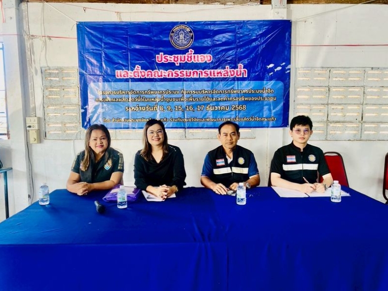 วันที่ 14 มกราคม 2569 นายวิชัย ทองประไพ ประมงจังหวัดสระแก้ว มอบหมายให้นายอุดม คูณดอน หัวหน้ากลุ่มบริหารจัดการด้านการประมง นางนุชนารถ หนุนอริยทรัพย์ ประมงอำเภออรัญประเทศ นายไชยวัฒน์ ปิจจะ เจ้าพนักงานประมงปฎิบัติงาน นางสาววิริยา ชันษา นักวิชาการประมง และนางสาวปองกานต์ ป้องกัน เจ้าพนักงานธุรการ พร้อมด้วยนางนวพร ดุลยสิริวิทย์ ผู้อำนวยการศูนย์วิจัยและพัฒนาการเพาะเลี้ยงสัตว์น้ำจืดสระแก้ว ร่วมกับผู้นำท้องถิ่น เข้าร่วมประชุมชี้แจงโครงการบริหารจัดการทรัพยากรประมง กิจกรรมบริหารจัดการทรัพยากรประมงน้ำจืด การเพิ่มผลผลิตสัตว์น้ำในแหล่งน้ำชุมชนเพื่อเพิ่มรายได้และลดค่าครองชีพของประชาชน ประจำปีงบประมาณ 2569 เพื่อชี้แจงแนวทางการดำเนินงานการบริหารจัดการแหล่งน้ำ และคัดเลือกคณะกรรมการแหล่งน้ำ ดังนี้