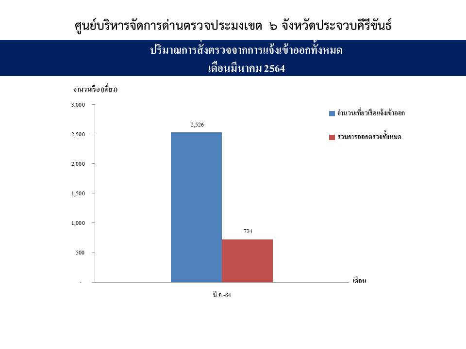 จำนวนเที่ยวเรือแจ้งเข้าออกและผลการออกตรวจทั้ง3ศูนย์ เขตพื้นที่จังหวัดประจวบคีรีขันธ์ ด่านตรวจประมงเขต6 (ประจวบคีรีขันธ์) ประจำเดือน มีนาคม ปี64