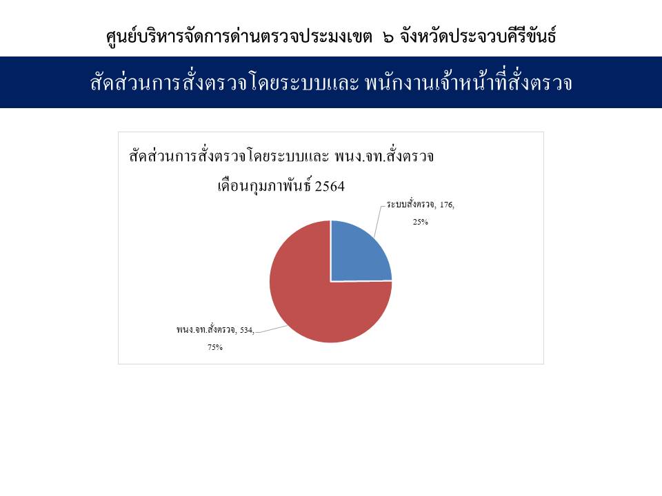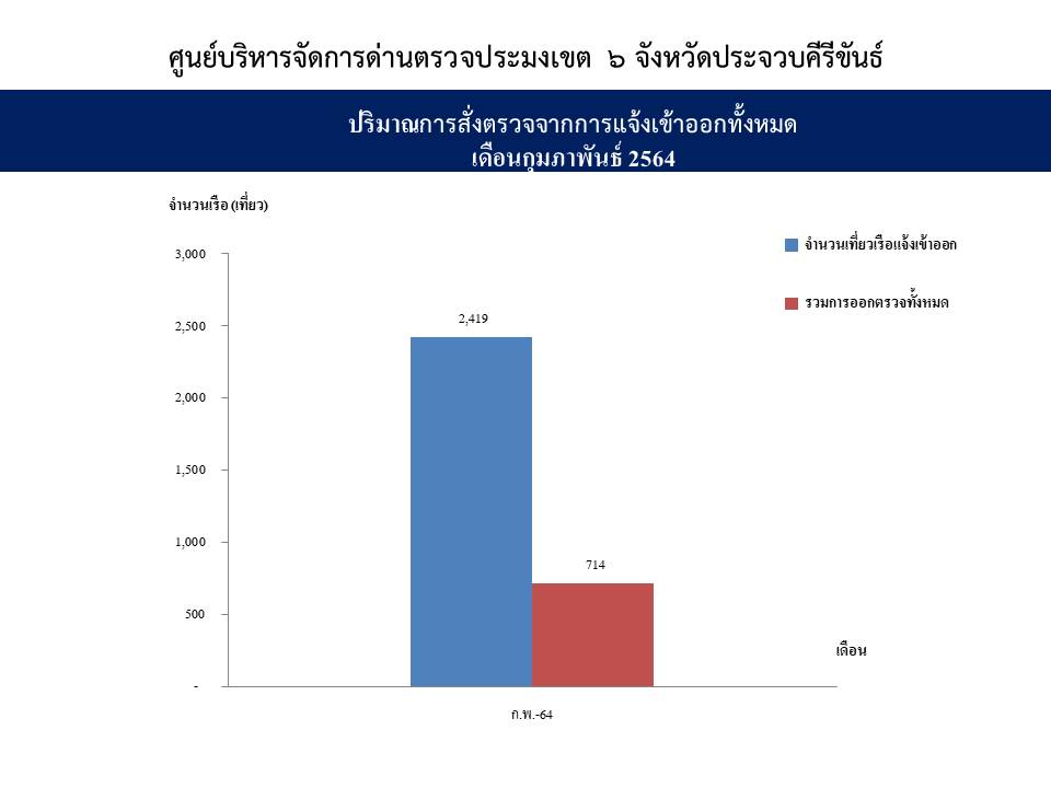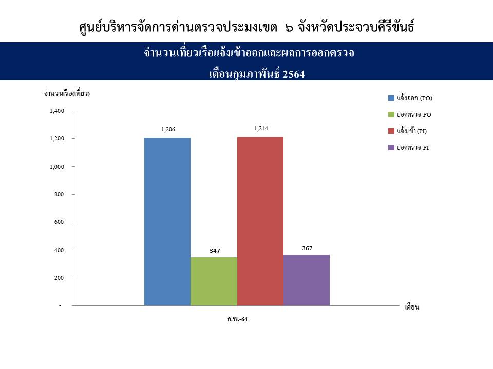 จำนวนยอดเที่ยวเรือแจ้งเข้าออกและผลการออกตรวจ เดือนกุมภาพันธ์ 2564 ด่านตรวจประมงเขต 6 ประจวบคีรีขันธ์ (ทั้ง3ศูนย์)