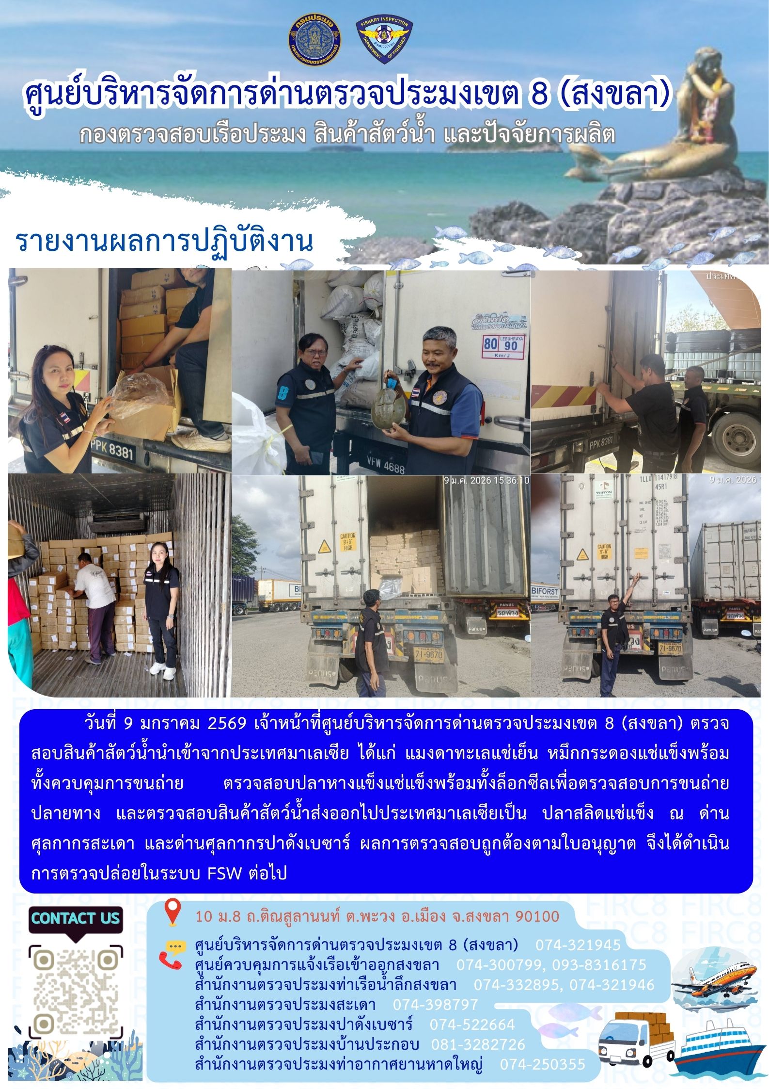 NEW ประชาสัมพันธ์การปฏิบัติงานศูนย์บริหารจัดการด่านตรวจประมงเขต 8 (สงขลา) ประจำวันที่ 8-10 มกราคม 2569..คลิก