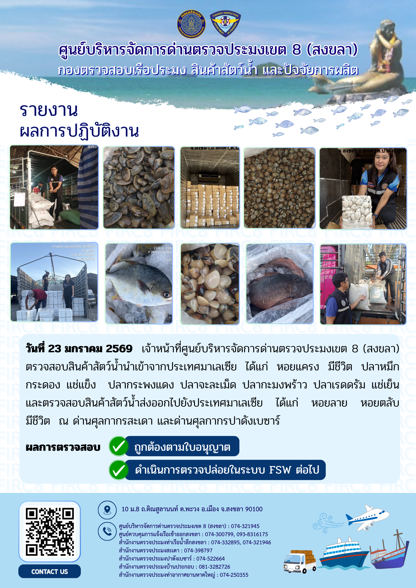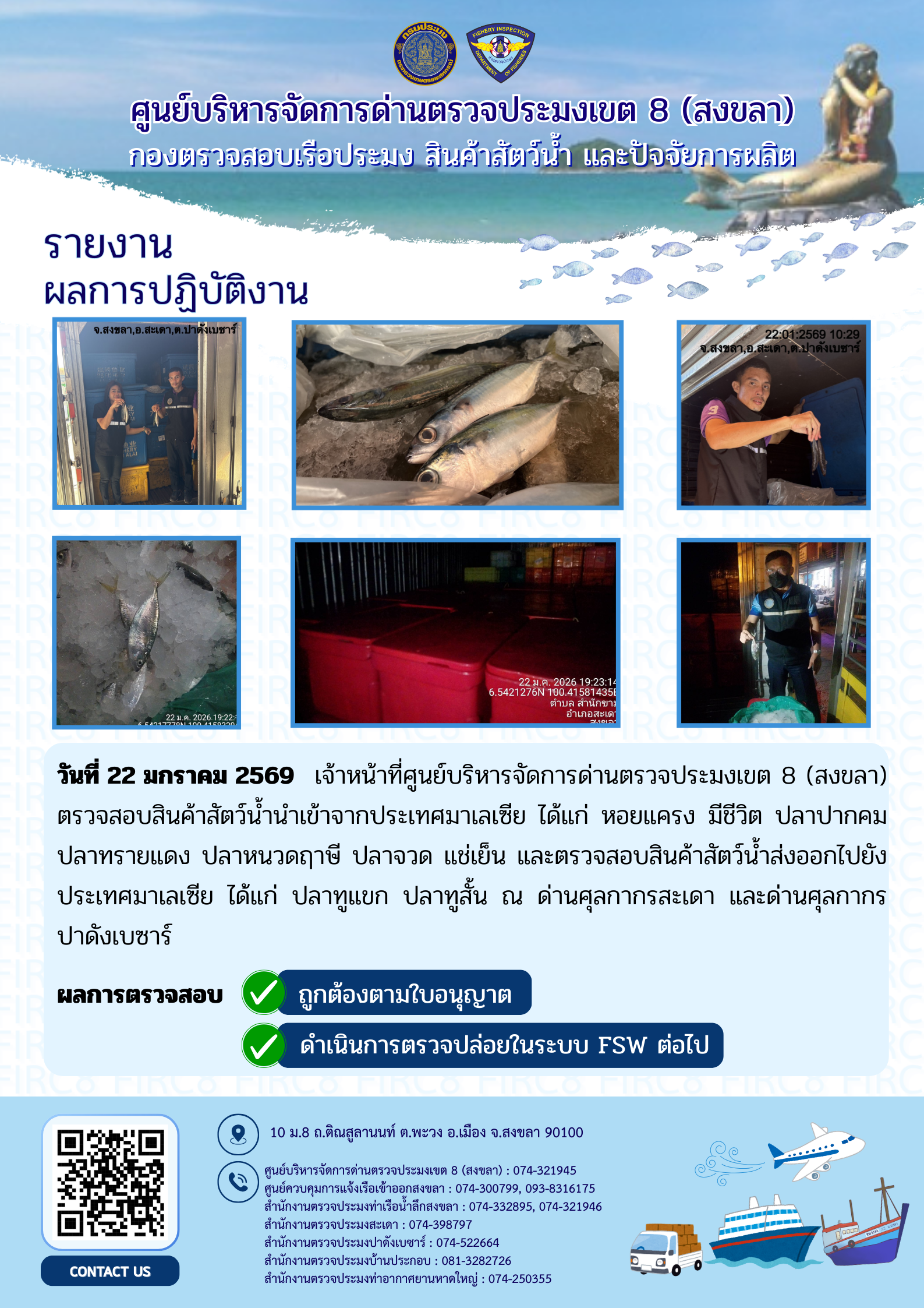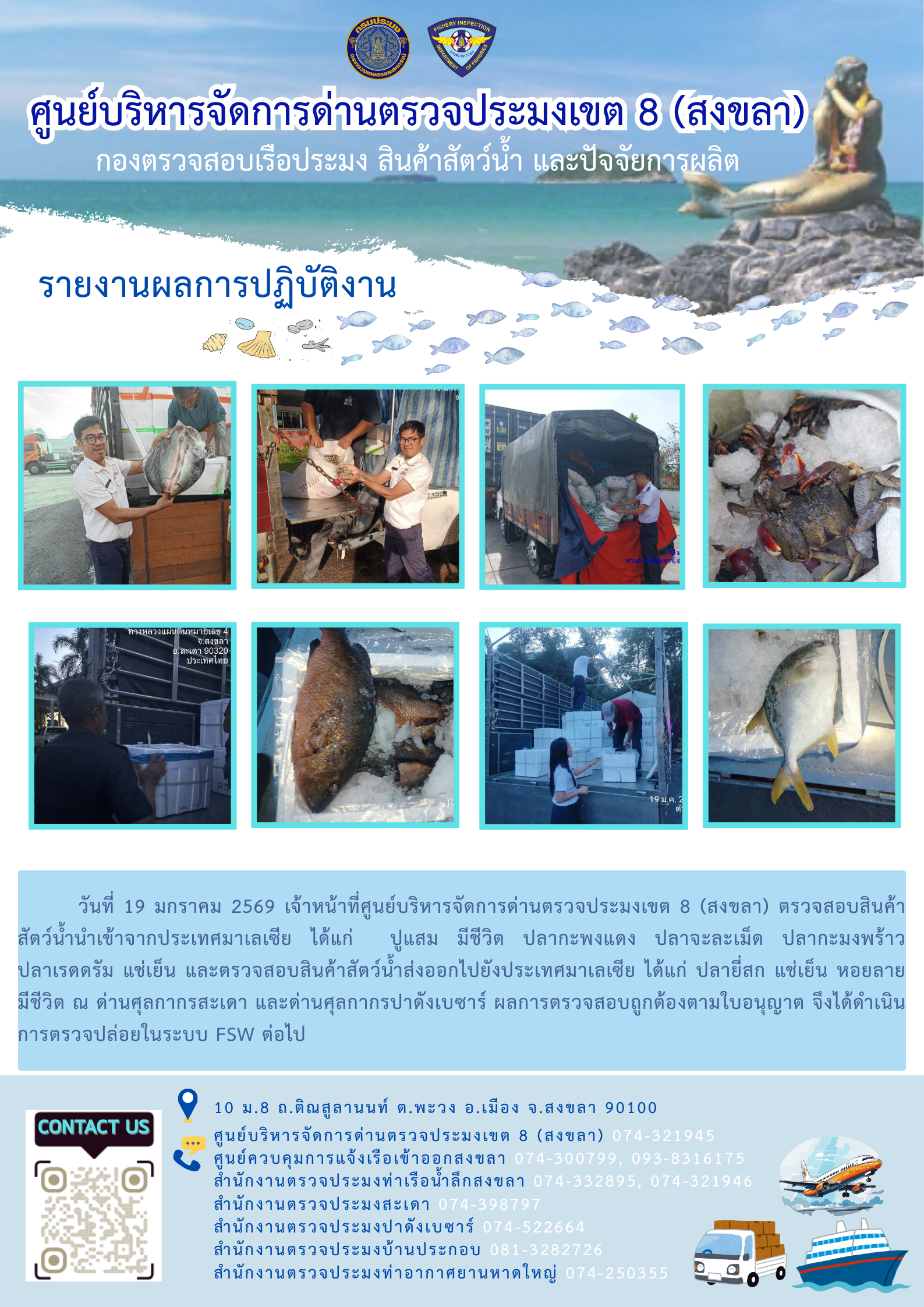 ประชาสัมพันธ์การปฏิบัติงานศูนย์บริหารจัดการด่านตรวจประมงเขต 8 (สงขลา) ประจำวันที่ 19-23 มกราคม 2569