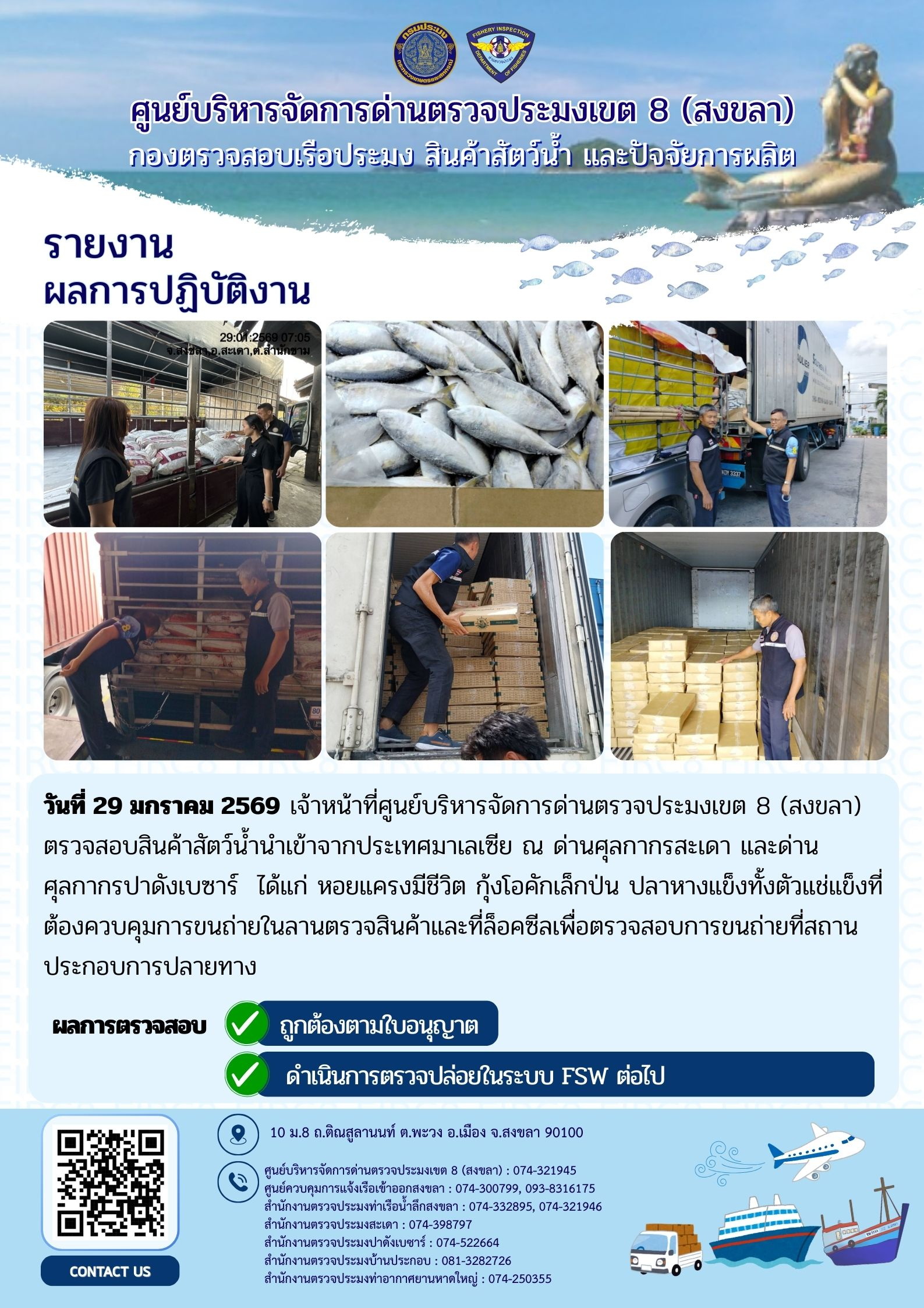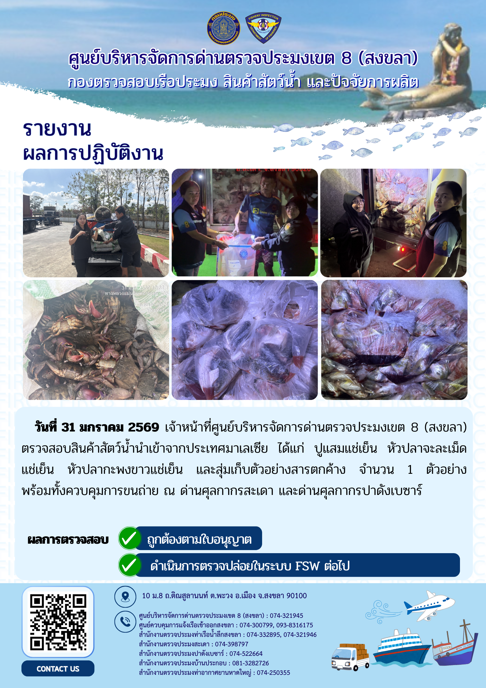 NEW ประชาสัมพันธ์การปฏิบัติงานศูนย์บริหารจัดการด่านตรวจประมงเขต 8 (สงขลา) ประจำวันที่ 28-31 มกราคม 2569..คลิก