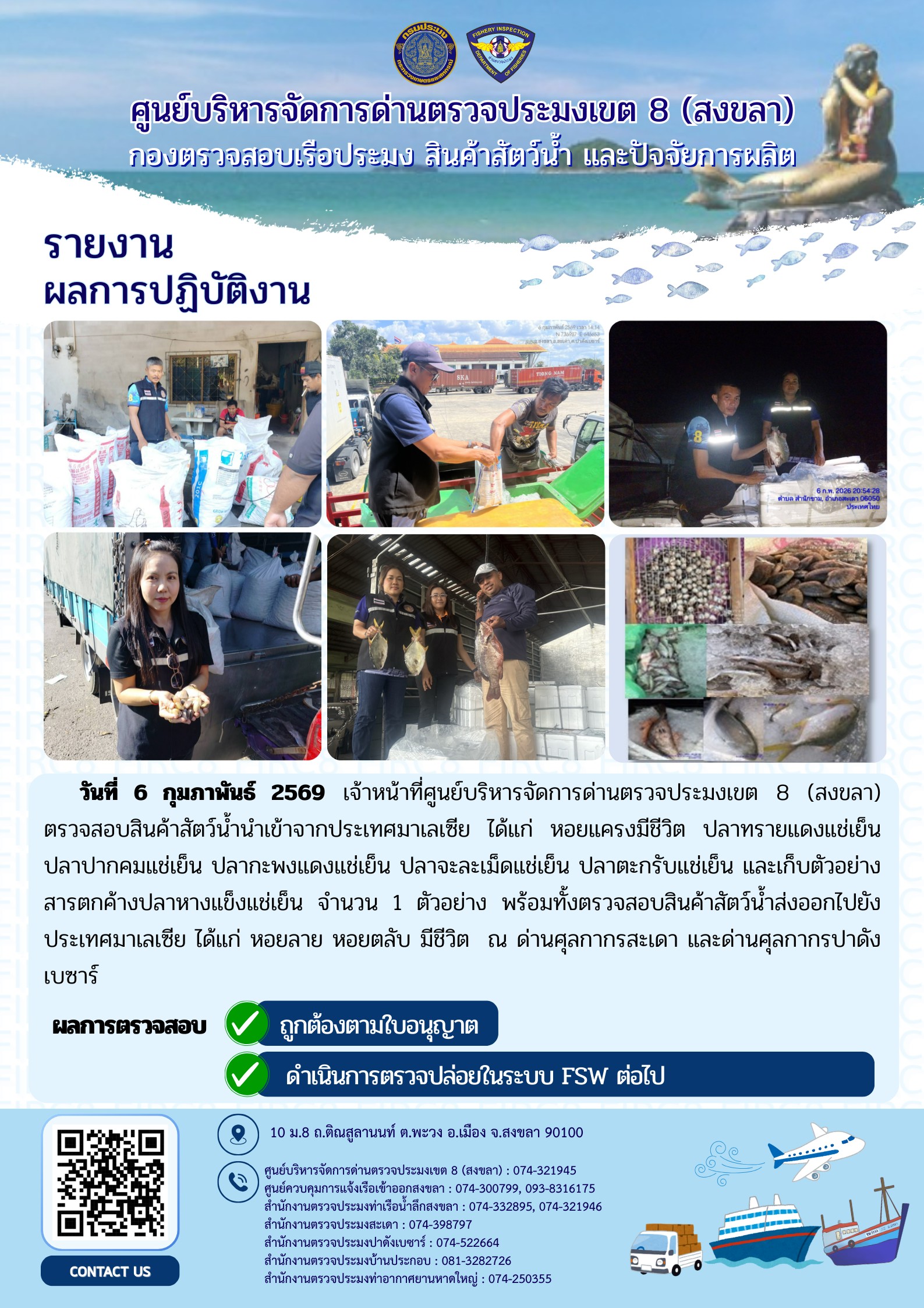 ผลการปฏิบัติงานศูนย์บริหารจัดการด่านตรวจประมงเขต 8 (สงขลา) ผ่านด่านศุลกากรสะเดา และด่านศุลกากรปาดังเบซาร์ ประจำวันที่ 6 กุมภาพันธ์ 2569