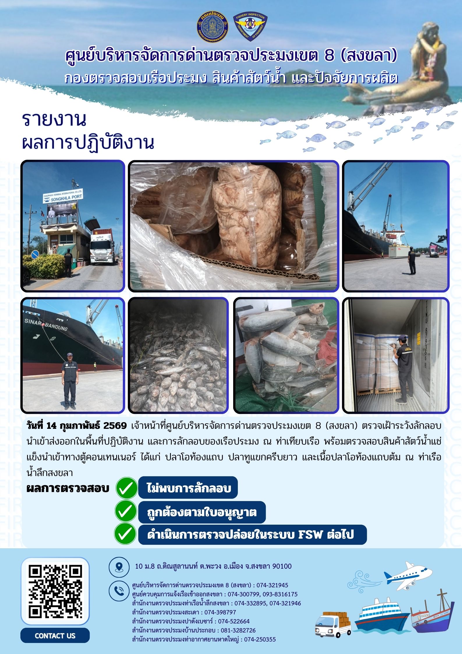 ผลการปฏิบัติงานศูนย์บริหารจัดการด่านตรวจประมงเขต 8 (สงขลา) ประจำวันที่ 14 กุมภาพันธ์ 2569