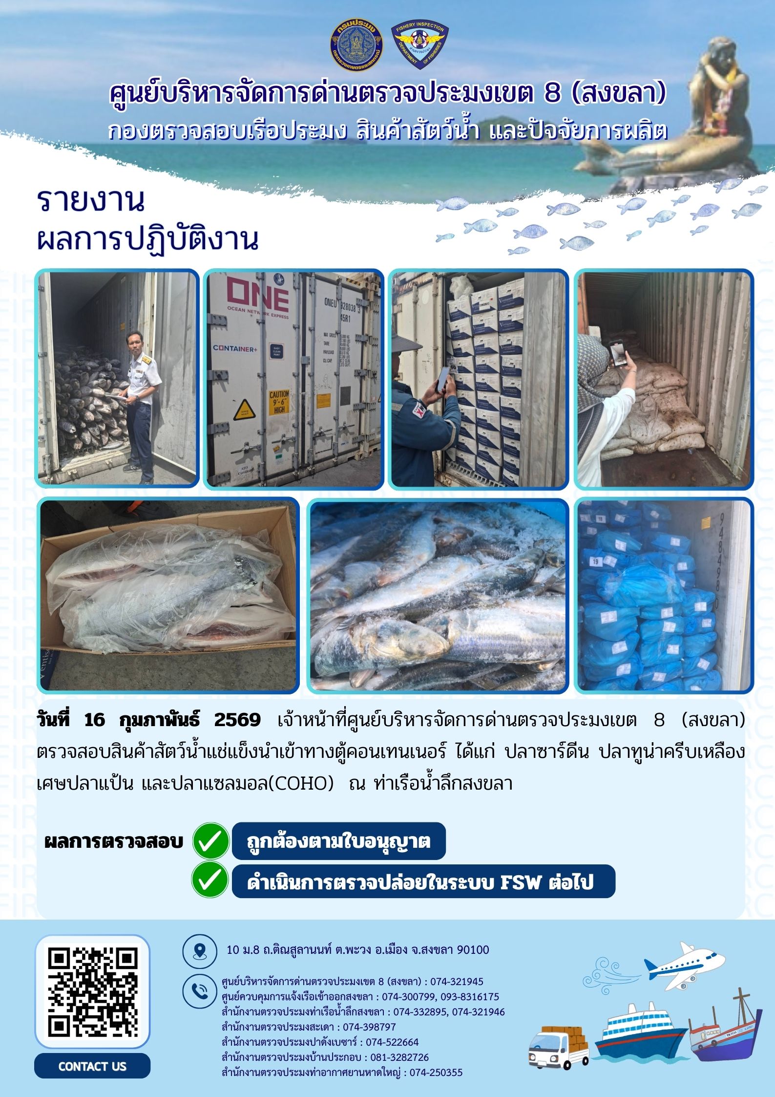 ผลการปฏิบัติงานศูนย์บริหารจัดการด่านตรวจประมงเขต 8 (สงขลา) ประจำวันที่ 16 กุมภาพันธ์ 2569
