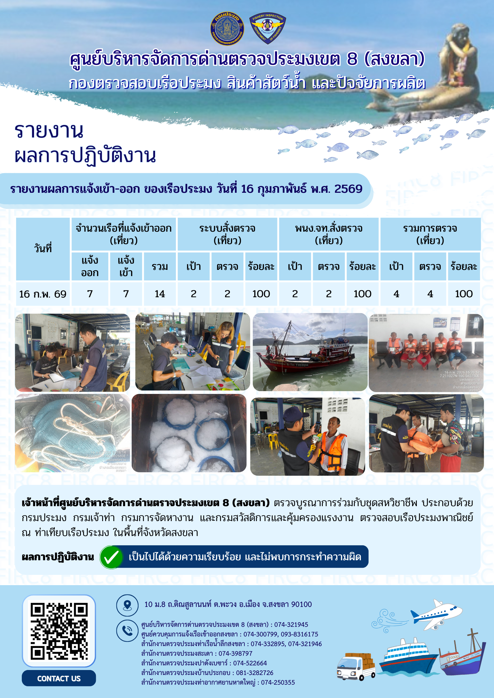 NEW ผลการปฏิบัติงานศูนย์บริหารจัดการด่านตรวจประมงเขต 8 (สงขลา) ประจำวันที่ 16 กุมภาพันธ์ 2569..คลิก
