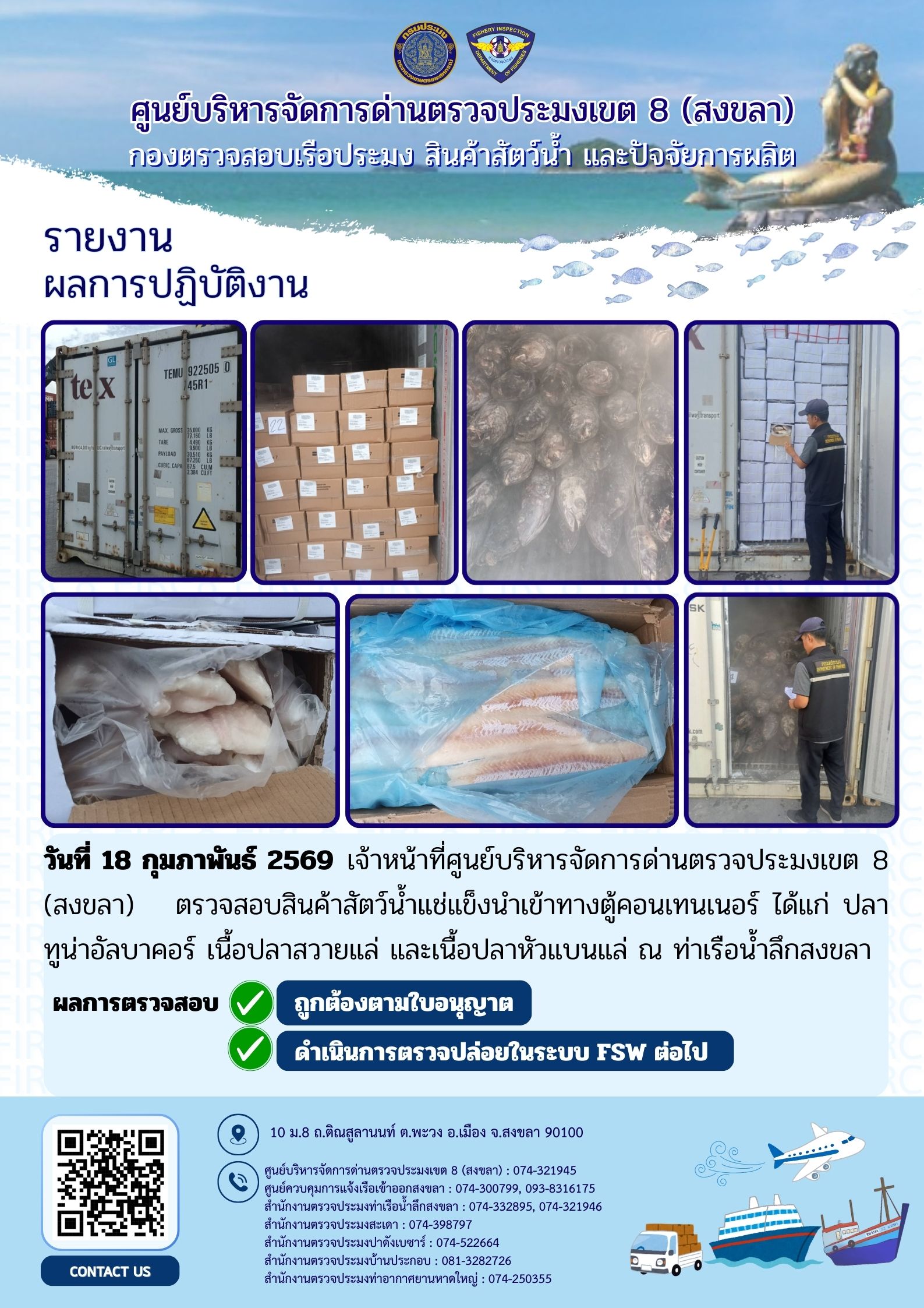 NEW ผลการปฏิบัติงานศูนย์บริหารจัดการด่านตรวจประมงเขต 8 (สงขลา) ประจำวันที่ 18 กุมภาพันธ์ 2569..คลิก