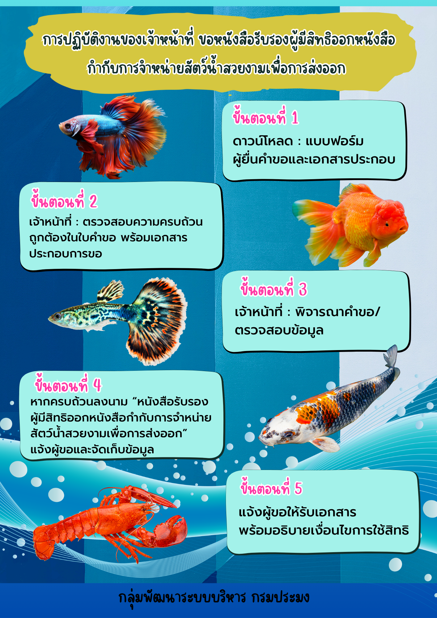 45. การขอหนังสือรับรองเป็นผู้มีสิทธิออกหนังสือกำกับการจำหน่ายสัตว์น้ำสวยงามเพื่อการส่งออก