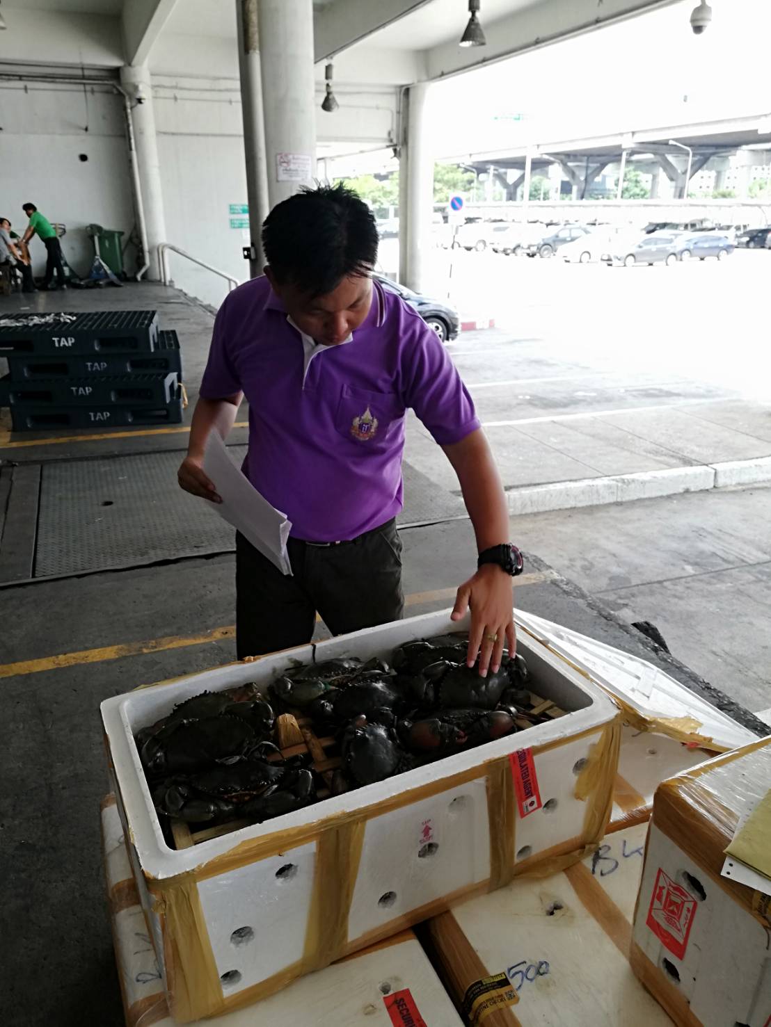 วันที่ 11 พฤษภาคม 2561 เวลา 11.30 น. เจ้าหน้าที่ด่านตรวจสัตว์น้ำท่าอากาศยานดอนเมืองตรวจสอบสินค้าสัตว์น้ำนำเข้าประเภท ปูทะเล มีชีวิต จำนวน 5 กล่อง น้ำหนัก 118 กิโลกรัม นำเข้าจากประเทศอินโดนิเซีย เที่ยวบินที่ QZ / 154 ถูกต้องตรงตามใบอนุญาต จึงตรวจปล่อยอนุญาตให้นำเข้าต่อไป