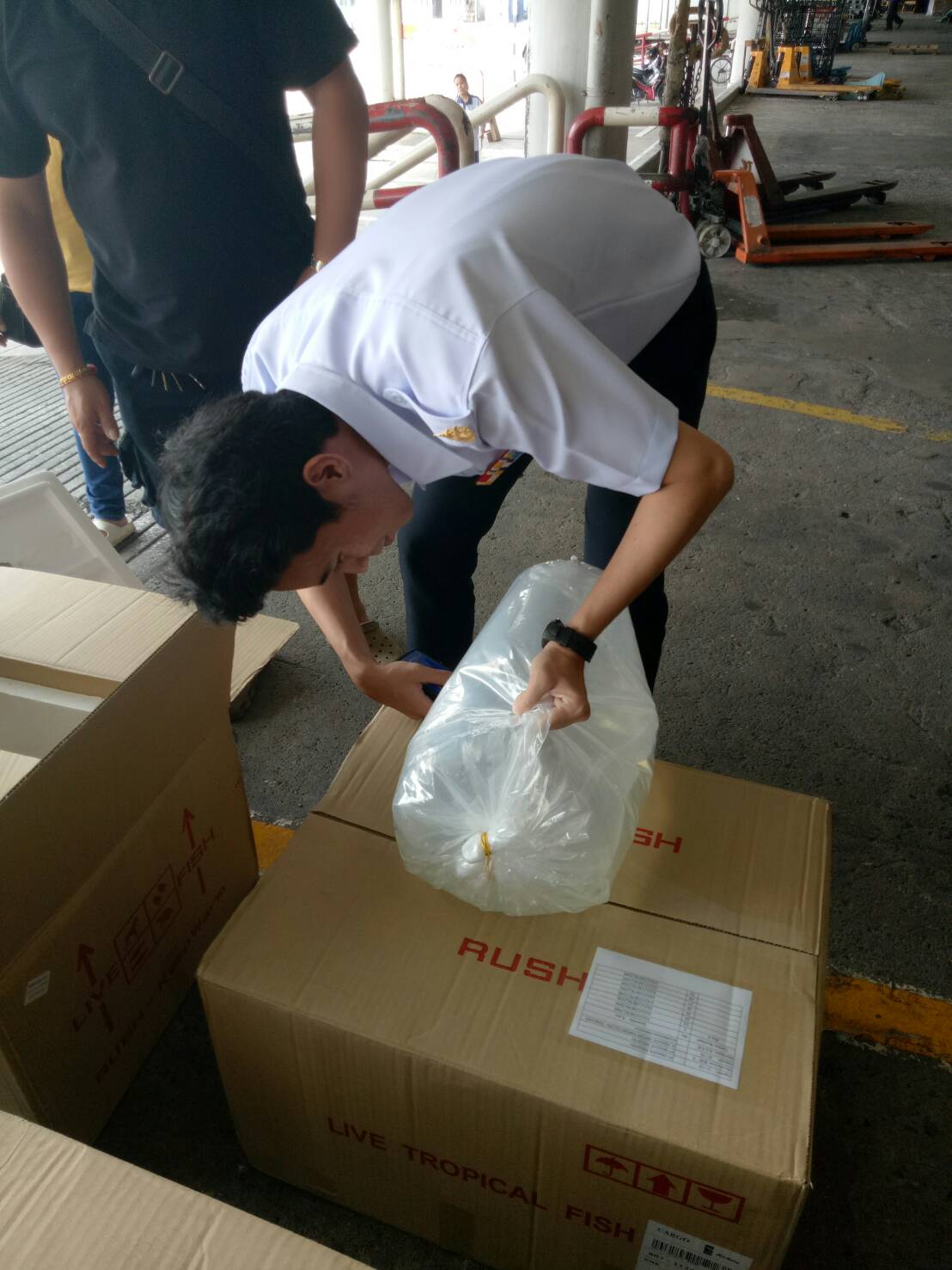 วันที่ 31 กรกฎาคม 2561 เวลา 13.00 น. เจ้าหน้าที่ด่านตรวจสัตว์น้ำท่าอากาศยานดอนเมือง ตรวจสอบสินค้าสัตว์น้ำนำเข้า ประเภทปลาอะโรวาน่ามีชีวิต จำนวน 23 ตัว นำเข้ามาจากประเทศมาเลเซีย เที่ยวบินที่ AK/890 ผลการตรวจสอบ Microchip No. ถูกต้องตรงตามใบอนุญาต CITES และใบอนุญาตนำเข้าฯ จึงได้ทำการตรวจปล่อยอนุญาตให้นำเข้าต่อไป
