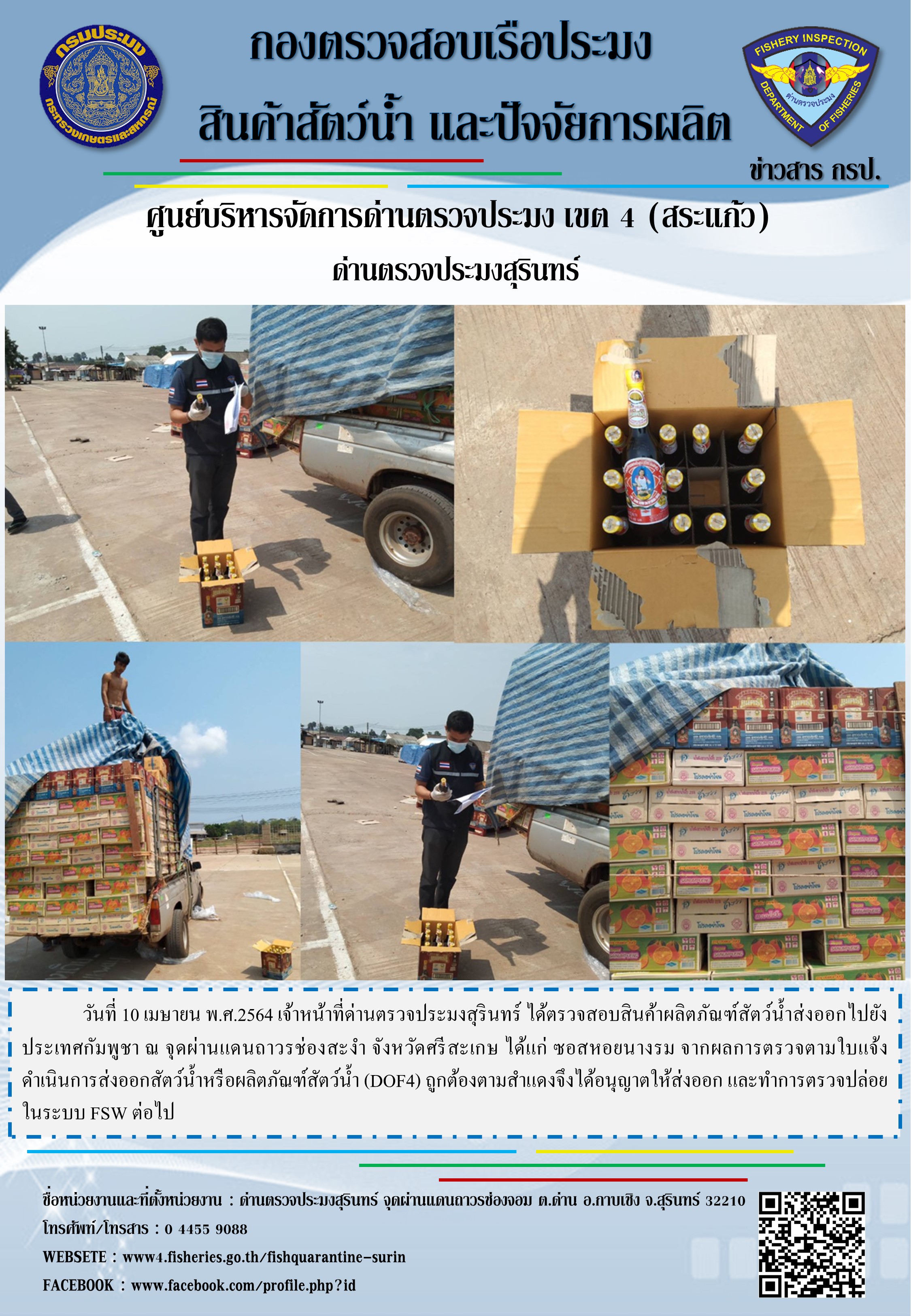 วันที่ 10 เมษายน พ.ศ.2564 เจ้าหน้าที่ด่านตรวจประมงสุรินทร์ ได้ตรวจสอบสินค้าผลิตภัณฑ์สัตว์น้ำส่งออกไปยังประเทศกัมพูชา ณ จุดผ่านแดนถาวรช่องสะงำ จังหวัดศรีสะเกษ ได้แก่ ซอสหอยนางรม จากผลการตรวจตามใบแจ้งดำเนินการส่งออกสัตว์น้ำหรือผลิตภัณฑ์สัตว์น้ำ (DOF4) ถูกต้องตามสำแดงจึงได้อนุญาตให้ส่งออก และทำการตรวจปล่อยในระบบ FSW ต่อไป