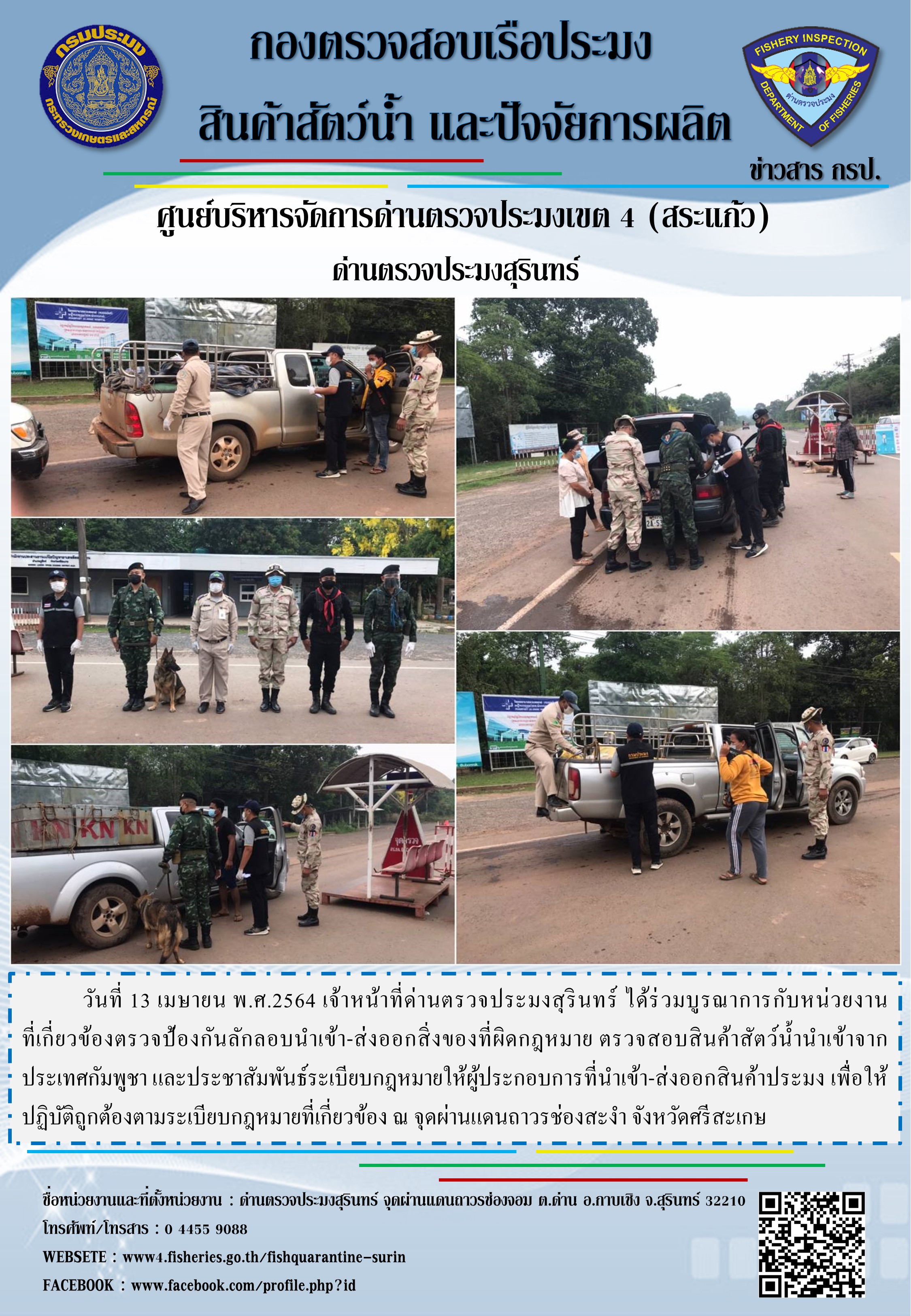 วันที่ 13 เมษายน พ.ศ.2564 เจ้าหน้าที่ด่านตรวจประมงสุรินทร์ ได้ร่วมบูรณาการกับหน่วยงานที่เกี่ยวข้องตรวจป้องกันลักลอบนำเข้า-ส่งออกสิ่งของที่ผิดกฎหมาย ตรวจสอบสินค้าสัตว์น้ำนำเข้าจากประเทศกัมพูชา และประชาสัมพันธ์ระเบียบกฎหมายให้ผู้ประกอบการที่นำเข้า-ส่งออกสินค้าประมง เพื่อให้ปฏิบัติถูกต้องตามระเบียบกฎหมายที่เกี่ยวข้อง ณ จุดผ่านแดนถาวรช่องสะงำ จังหวัดศรีสะเกษ