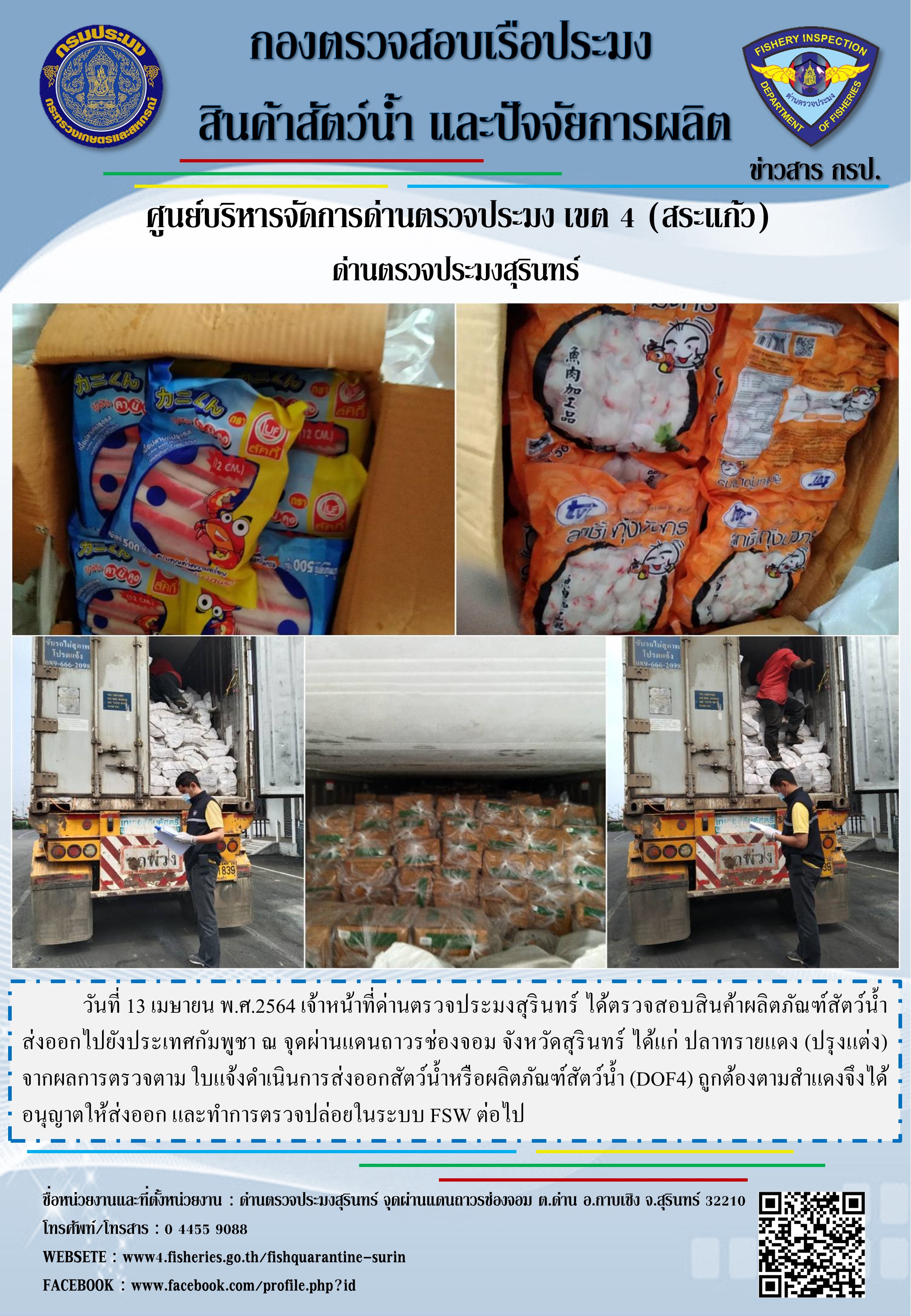 วันที่ 13 เมษายน พ.ศ.2564 เจ้าหน้าที่ด่านตรวจประมงสุรินทร์ ได้ตรวจสอบสินค้าผลิตภัณฑ์สัตว์น้ำ ส่งออกไปยังประเทศกัมพูชา ณ จุดผ่านแดนถาวรช่องจอม จังหวัดสุรินทร์ ได้แก่ ปลาทรายแดง (ปรุงแต่ง) จากผลการตรวจตาม ใบแจ้งดำเนินการส่งออกสัตว์น้ำหรือผลิตภัณฑ์สัตว์น้ำ (DOF4) ถูกต้องตามสำแดงจึงได้อนุญาตให้ส่งออก และทำการตรวจปล่อยในระบบ FSW ต่อไป