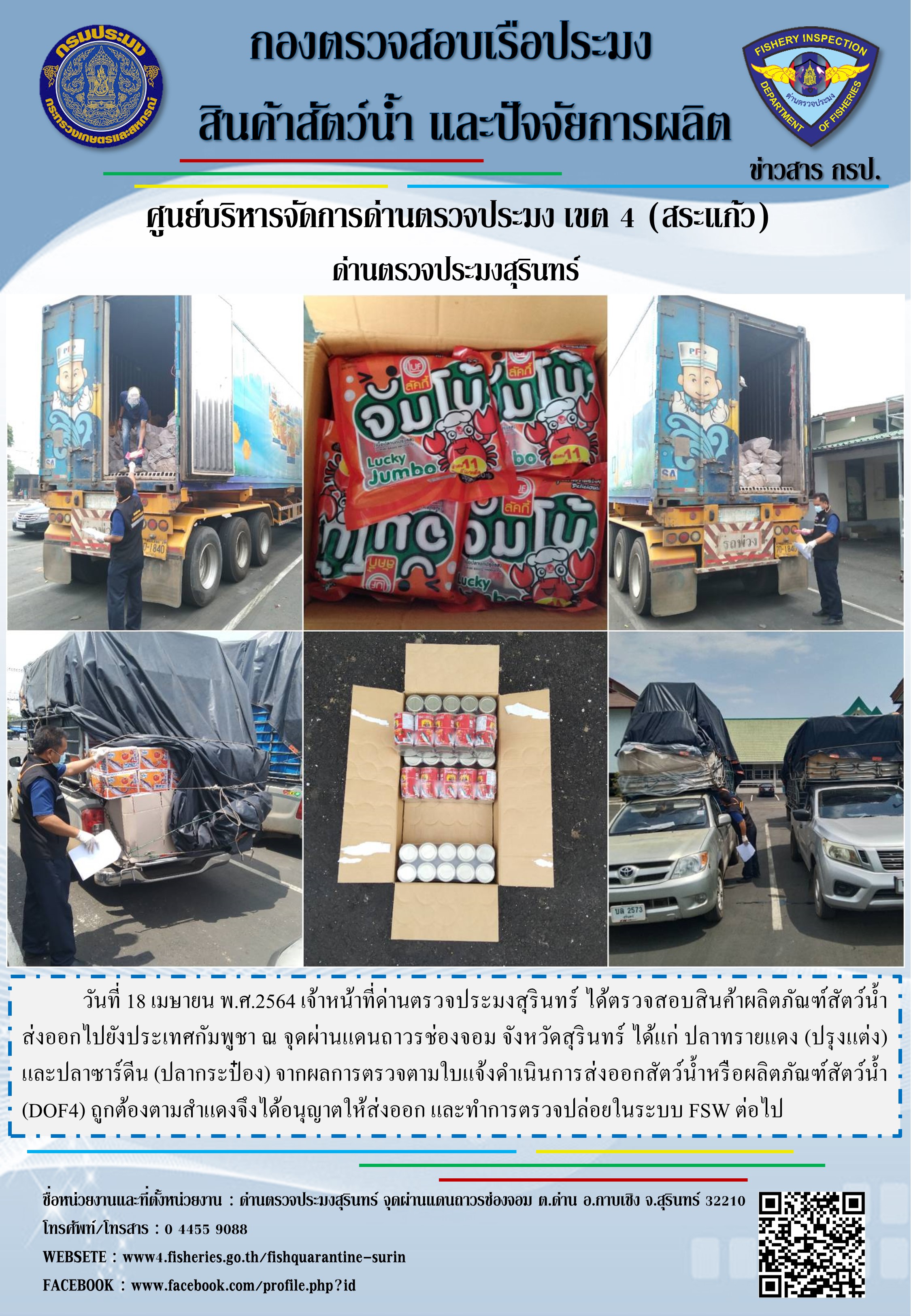 วันที่ 18 เมษายน พ.ศ.2564 เจ้าหน้าที่ด่านตรวจประมงสุรินทร์ ได้ตรวจสอบสินค้าผลิตภัณฑ์สัตว์น้ำ ส่งออกไปยังประเทศกัมพูชา ณ จุดผ่านแดนถาวรช่องจอม จังหวัดสุรินทร์ ได้แก่ ปลาทรายแดง (ปรุงแต่ง) และปลาซาร์ดีน (ปลากระป๋อง) จากผลการตรวจตามใบแจ้งดำเนินการส่งออกสัตว์น้ำหรือผลิตภัณฑ์สัตว์น้ำ (DOF4) ถูกต้องตามสำแดงจึงได้อนุญาตให้ส่งออก และทำการตรวจปล่อยในระบบ FSW ต่อไป