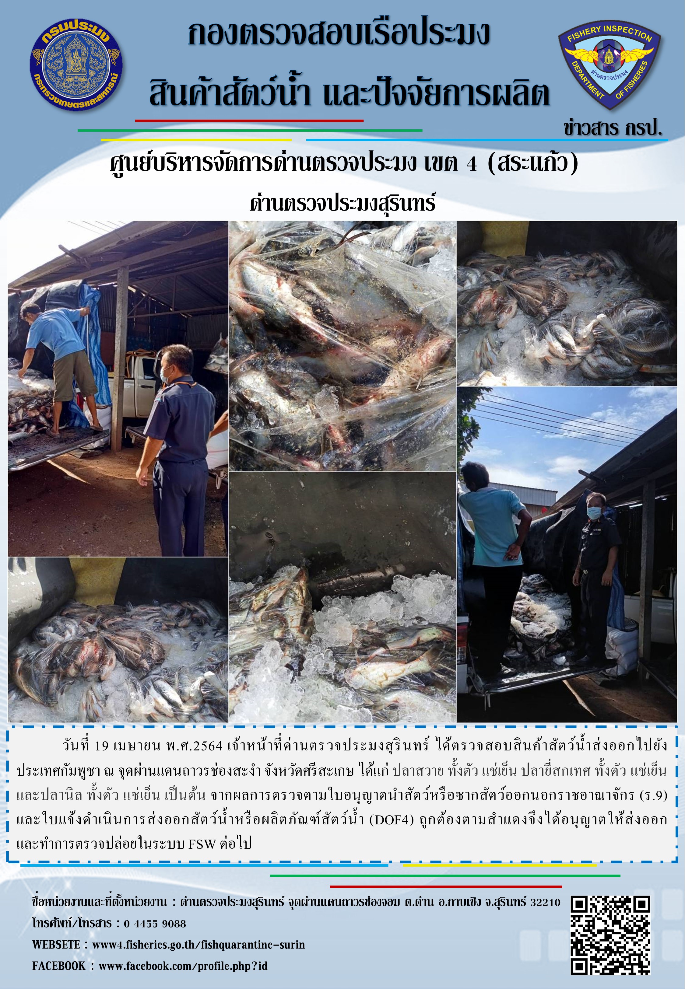 วันที่ 19 เมษายน พ.ศ.2564 เจ้าหน้าที่ด่านตรวจประมงสุรินทร์ ได้ตรวจสอบสินค้าสัตว์น้ำส่งออกไปยังประเทศกัมพูชา ณ จุดผ่านแดนถาวรช่องสะงำ จังหวัดศรีสะเกษ ได้แก่ ปลาสวาย ทั้งตัว แช่เย็น ปลายี่สกเทศ ทั้งตัว แช่เย็น และปลานิล ทั้งตัว แช่เย็น เป็นต้น จากผลการตรวจตามใบอนุญาตนำสัตว์หรือซากสัตว์ออกนอกราชอาณาจักร (ร.9) และใบแจ้งดำเนินการส่งออกสัตว์น้ำหรือผลิตภัณฑ์สัตว์น้ำ (DOF4) ถูกต้องตามสำแดงจึงได้อนุญาตให้ส่งออกและทำการตรวจปล่อยในระบบ FSW ต่อไป