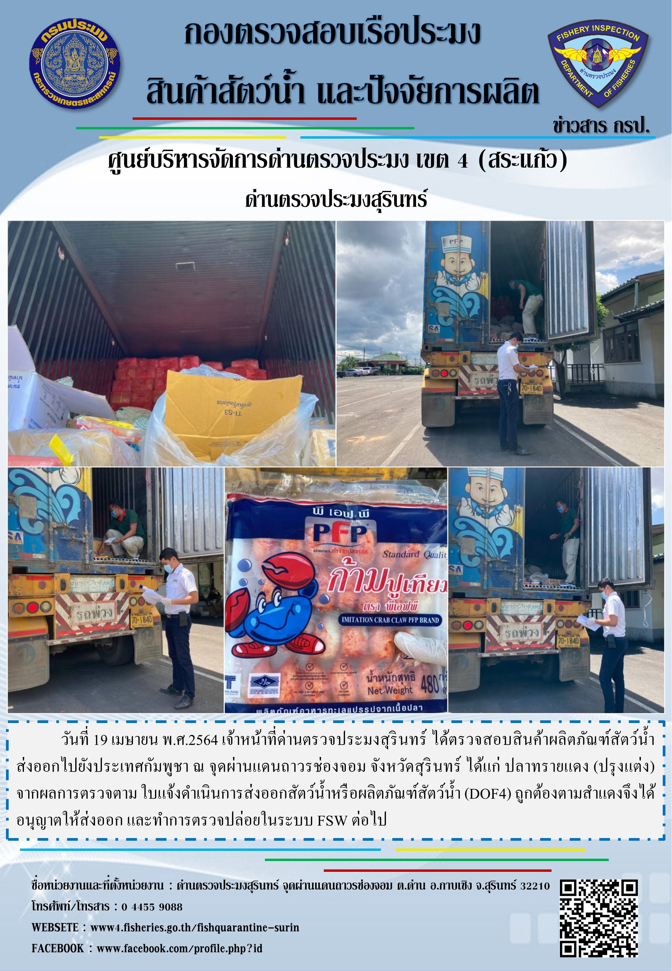 วันที่ 19 เมษายน พ.ศ.2564 เจ้าหน้าที่ด่านตรวจประมงสุรินทร์ ได้ตรวจสอบสินค้าผลิตภัณฑ์สัตว์น้ำ ส่งออกไปยังประเทศกัมพูชา ณ จุดผ่านแดนถาวรช่องจอม จังหวัดสุรินทร์ ได้แก่ ปลาทรายแดง (ปรุงแต่ง) จากผลการตรวจตาม ใบแจ้งดำเนินการส่งออกสัตว์น้ำหรือผลิตภัณฑ์สัตว์น้ำ (DOF4) ถูกต้องตามสำแดงจึงได้อนุญาตให้ส่งออก และทำการตรวจปล่อยในระบบ FSW ต่อไป