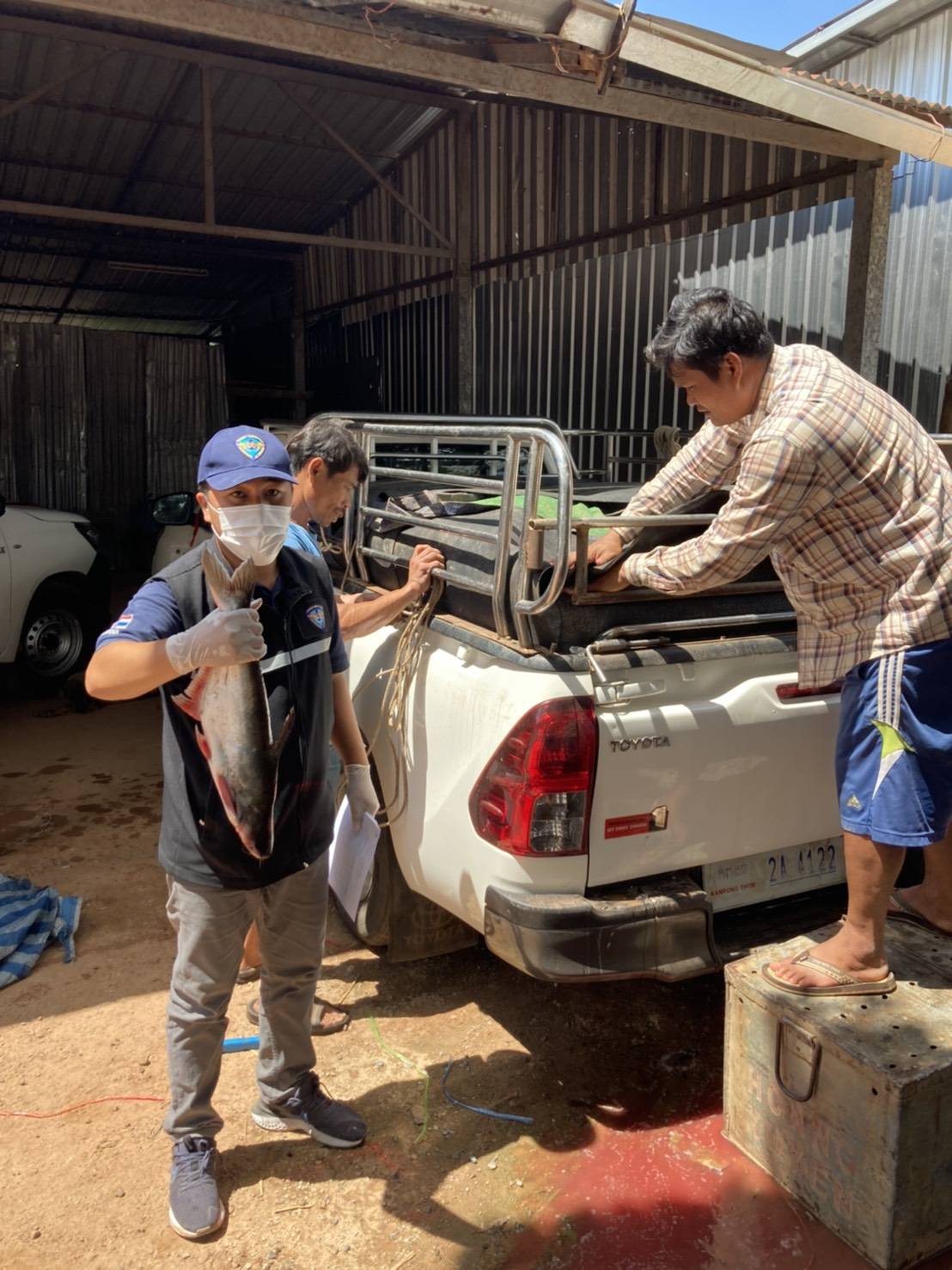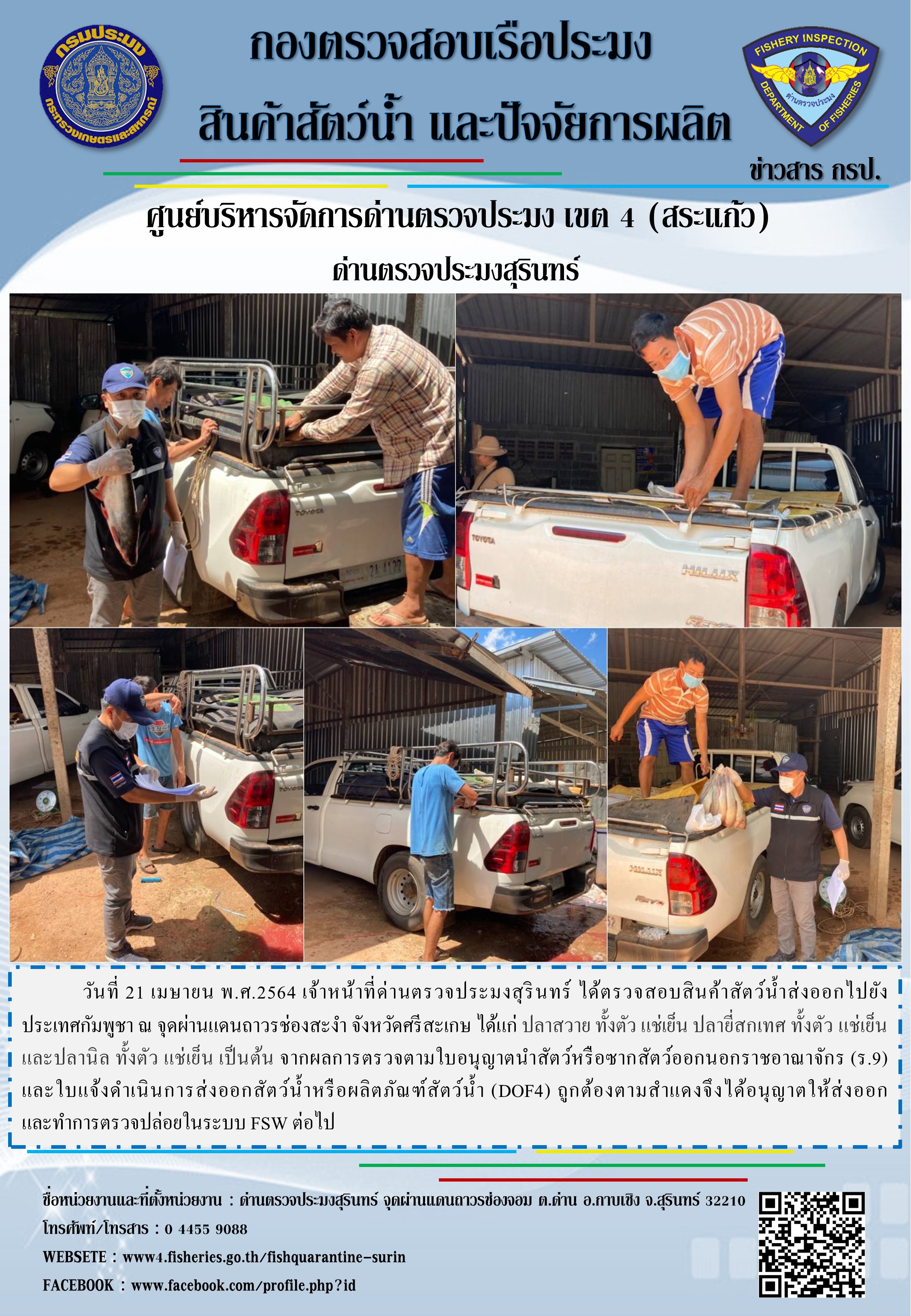 วันที่ 21 เมษายน พ.ศ.2564 เจ้าหน้าที่ด่านตรวจประมงสุรินทร์ ได้ตรวจสอบสินค้าสัตว์น้ำส่งออกไปยังประเทศกัมพูชา ณ จุดผ่านแดนถาวรช่องสะงำ จังหวัดศรีสะเกษ ได้แก่ ปลาสวาย ทั้งตัว แช่เย็น ปลายี่สกเทศ ทั้งตัว แช่เย็น และปลานิล ทั้งตัว แช่เย็น เป็นต้น จากผลการตรวจตามใบอนุญาตนำสัตว์หรือซากสัตว์ออกนอกราชอาณาจักร (ร.9) และใบแจ้งดำเนินการส่งออกสัตว์น้ำหรือผลิตภัณฑ์สัตว์น้ำ (DOF4) ถูกต้องตามสำแดงจึงได้อนุญาตให้ส่งออก และทำการตรวจปล่อยในระบบ FSW ต่อไป