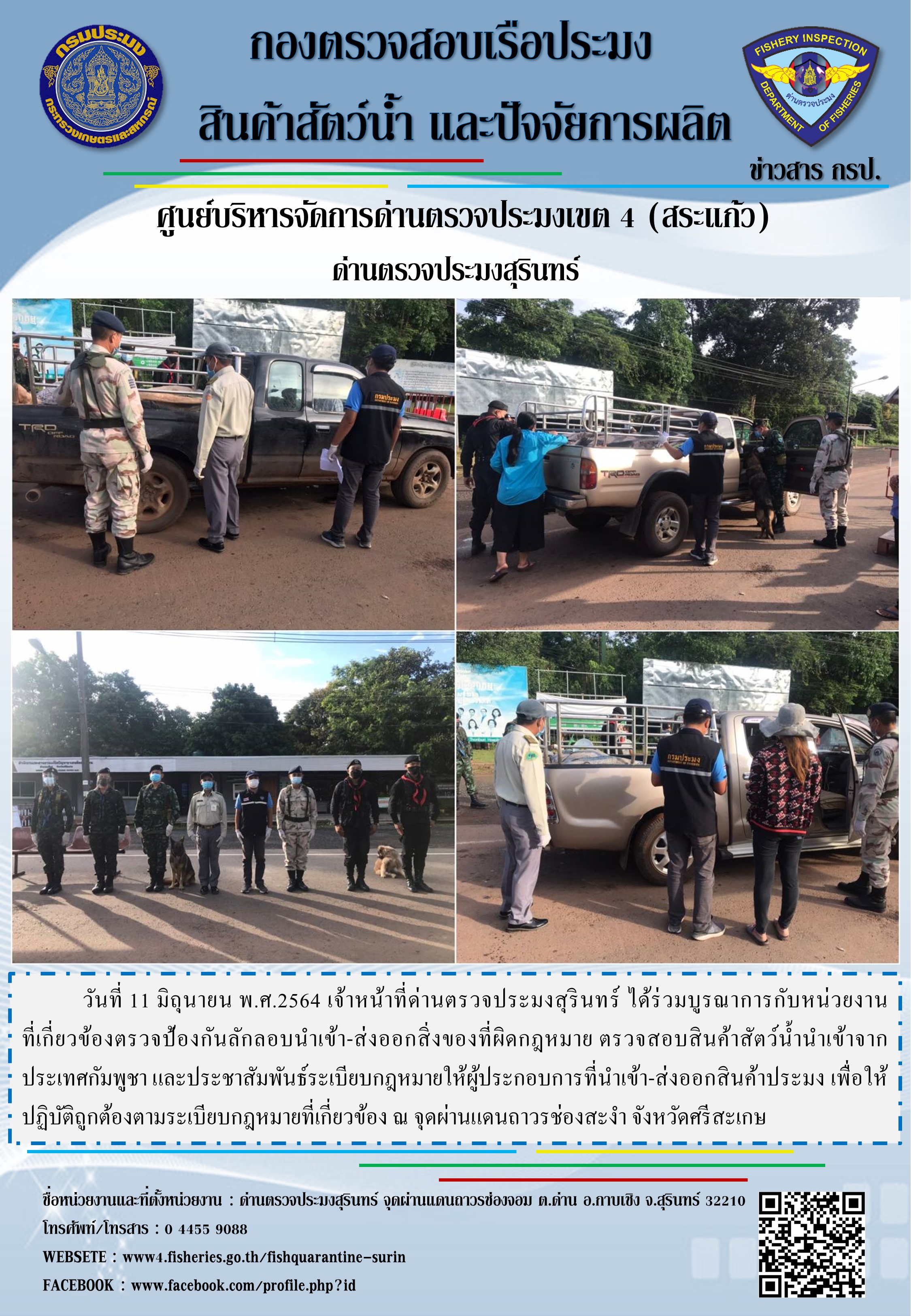 วันที่ 11 มิถุนายน พ.ศ.2564 เจ้าหน้าที่ด่านตรวจประมงสุรินทร์ ได้ร่วมบูรณาการกับหน่วยงานที่เกี่ยวข้องตรวจป้องกันลักลอบนำเข้า-ส่งออกสิ่งของที่ผิดกฎหมาย ตรวจสอบสินค้าสัตว์น้ำนำเข้าจากประเทศกัมพูชา และประชาสัมพันธ์ระเบียบกฎหมายให้ผู้ประกอบการที่นำเข้า-ส่งออกสินค้าประมง เพื่อให้ปฏิบัติถูกต้องตามระเบียบกฎหมายที่เกี่ยวข้อง ณ จุดผ่านแดนถาวรช่องสะงำ จังหวัดศรีสะเกษ