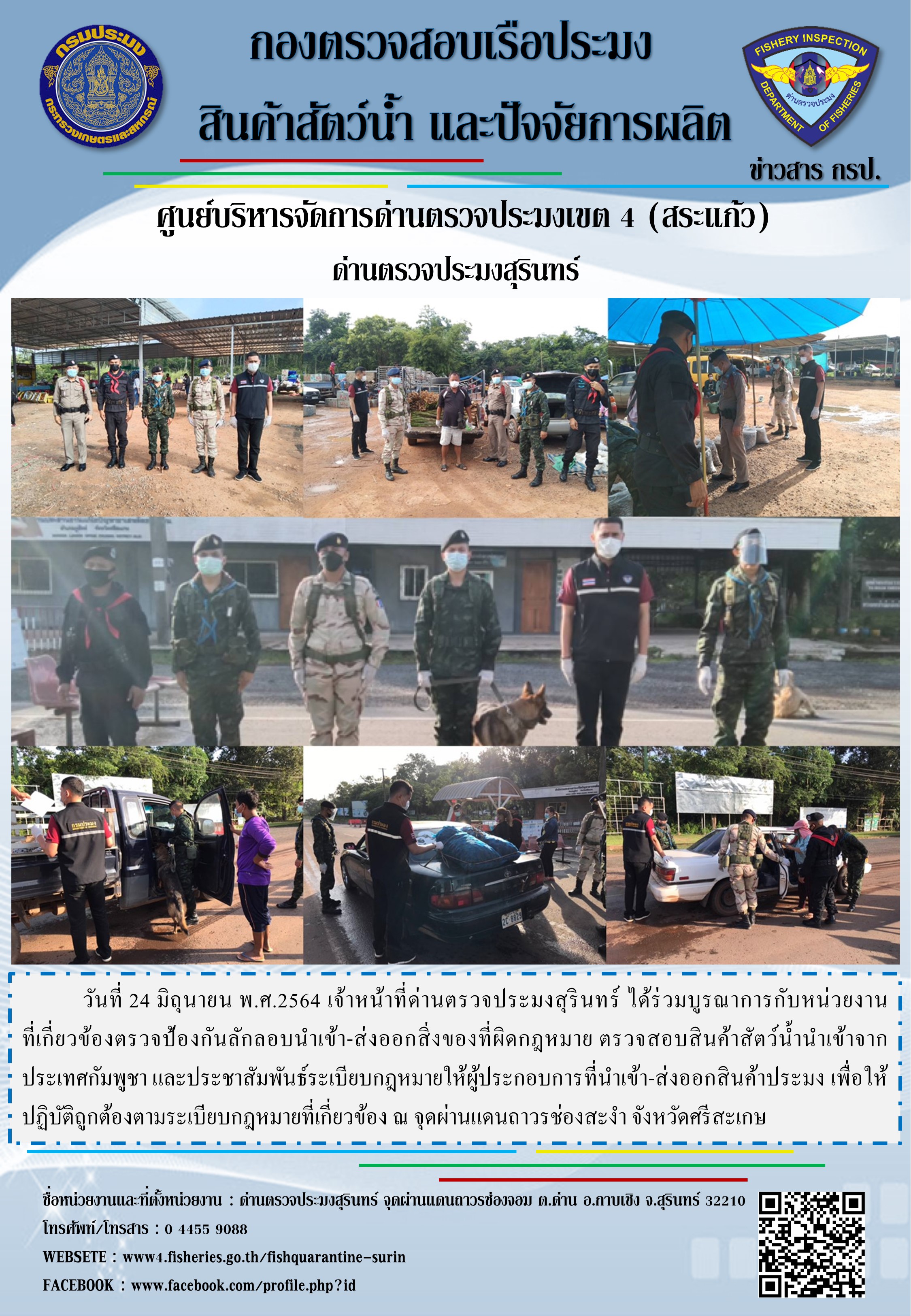 วันที่ 24 มิถุนายน พ.ศ.2564 เจ้าหน้าที่ด่านตรวจประมงสุรินทร์ ได้ร่วมบูรณาการกับหน่วยงานที่เกี่ยวข้องตรวจป้องกันลักลอบนำเข้า-ส่งออกสิ่งของที่ผิดกฎหมาย ตรวจสอบสินค้าสัตว์น้ำนำเข้าจากประเทศกัมพูชา และประชาสัมพันธ์ระเบียบกฎหมายให้ผู้ประกอบการที่นำเข้า-ส่งออกสินค้าประมง เพื่อให้ปฏิบัติถูกต้องตามระเบียบกฎหมายที่เกี่ยวข้อง ณ จุดผ่านแดนถาวรช่องสะงำ จังหวัดศรีสะเกษ