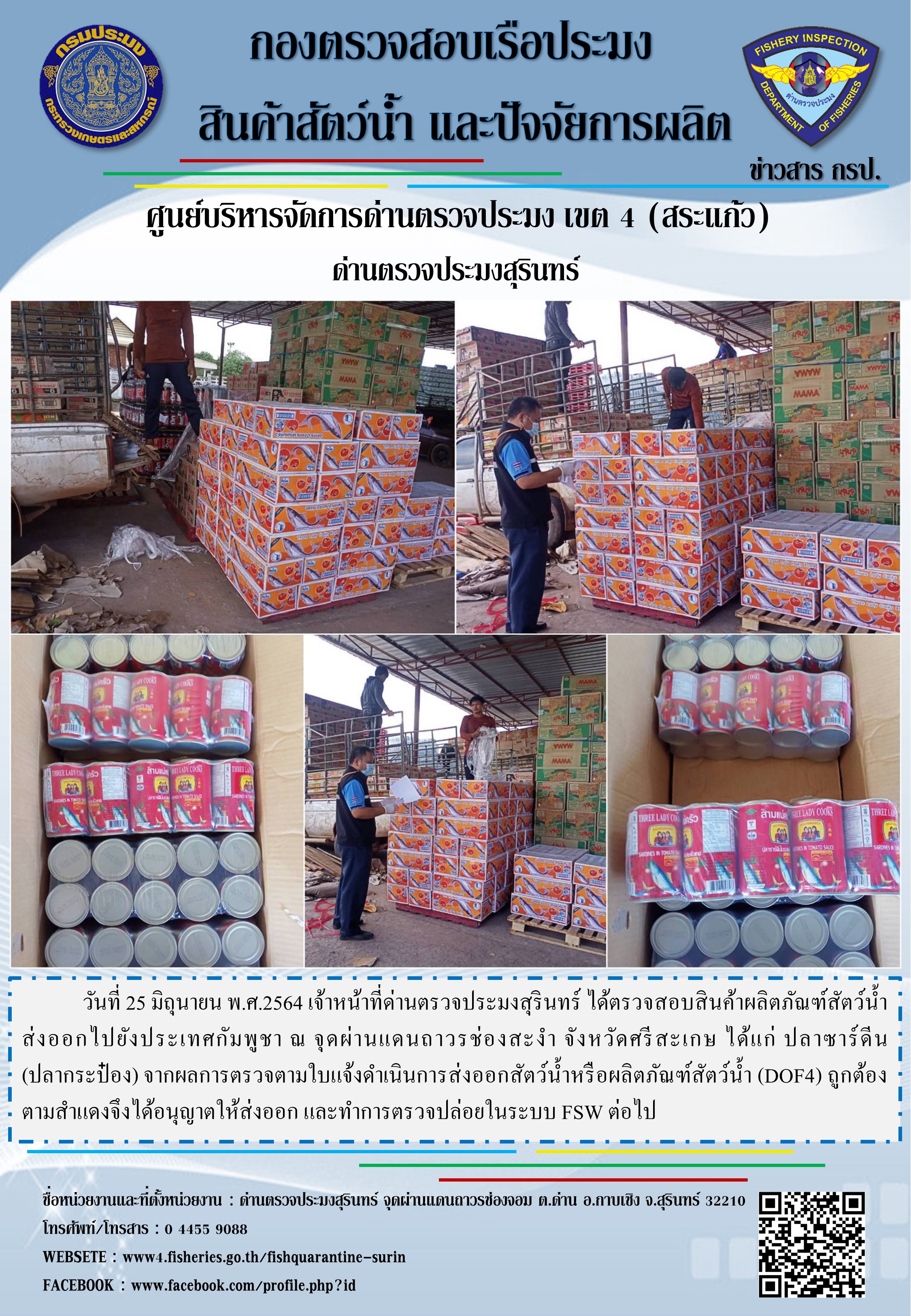 วันที่ 25 มิถุนายน พ.ศ.2564 เจ้าหน้าที่ด่านตรวจประมงสุรินทร์ ได้ตรวจสอบสินค้าผลิตภัณฑ์สัตว์น้ำส่งออกไปยังประเทศกัมพูชา ณ จุดผ่านแดนถาวรช่องสะงำ จังหวัดศรีสะเกษ ได้แก่ ปลาซาร์ดีน (ปลากระป๋อง) จากผลการตรวจตามใบแจ้งดำเนินการส่งออกสัตว์น้ำหรือผลิตภัณฑ์สัตว์น้ำ (DOF4) ถูกต้องตามสำแดงจึงได้อนุญาตให้ส่งออก และทำการตรวจปล่อยในระบบ FSW ต่อไป