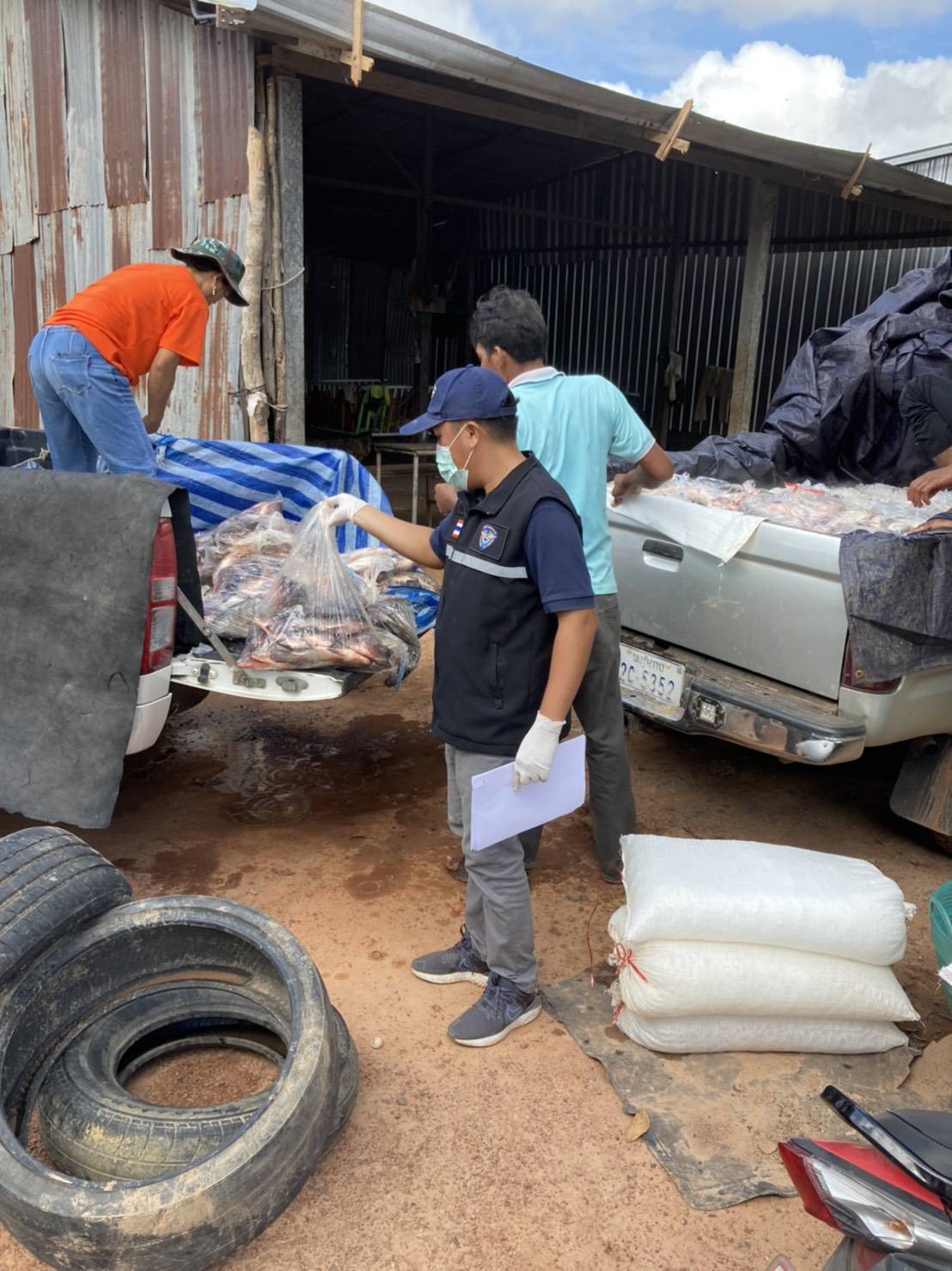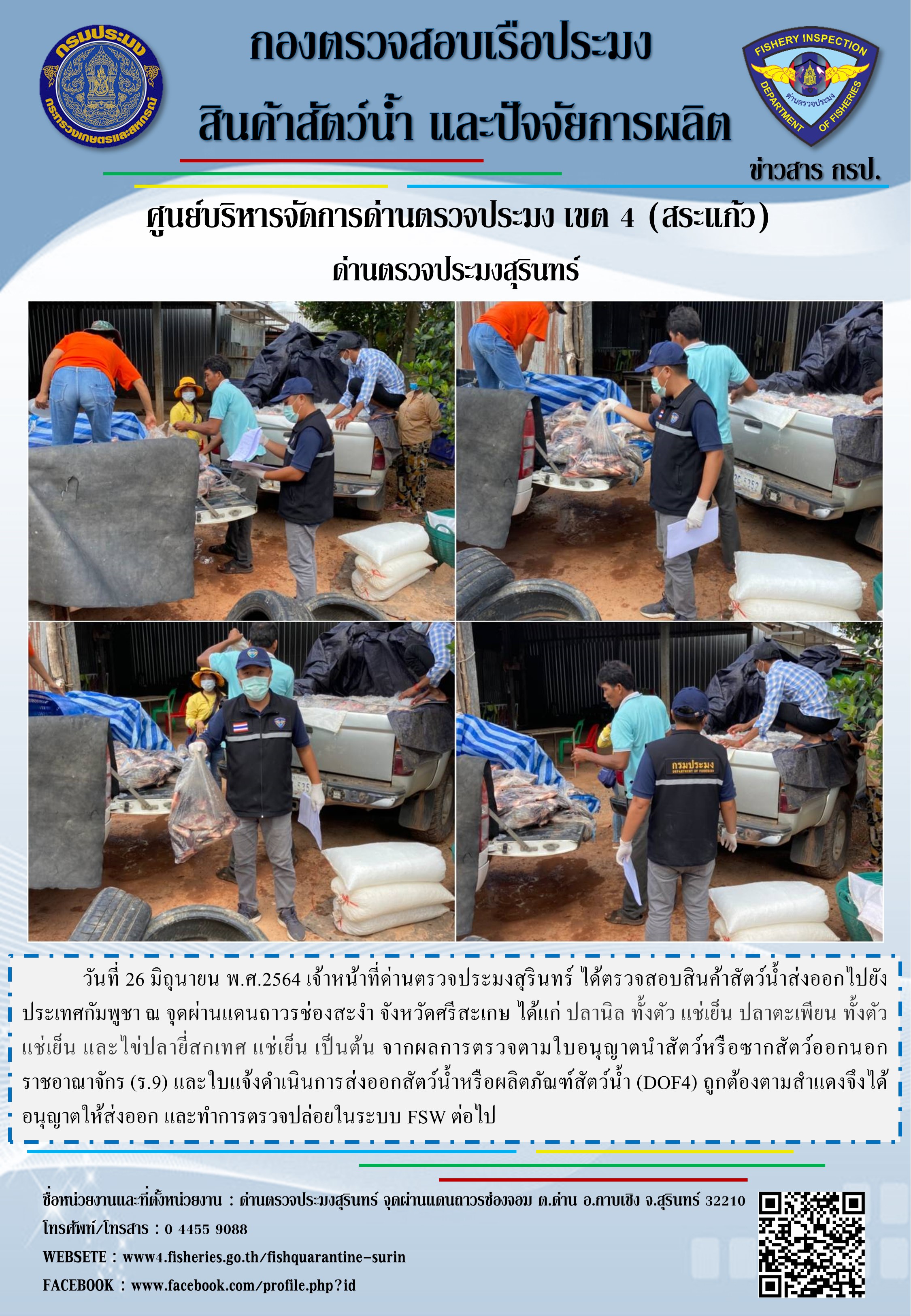 วันที่ 26 มิถุนายน พ.ศ.2564 เจ้าหน้าที่ด่านตรวจประมงสุรินทร์ ได้ตรวจสอบสินค้าสัตว์น้ำส่งออกไปยังประเทศกัมพูชา ณ จุดผ่านแดนถาวรช่องสะงำ จังหวัดศรีสะเกษ ได้แก่ ปลานิล ทั้งตัว แช่เย็น ปลาตะเพียน ทั้งตัว แช่เย็น และไข่ปลายี่สกเทศ แช่เย็น เป็นต้น จากผลการตรวจตามใบอนุญาตนำสัตว์หรือซากสัตว์ออกนอกราชอาณาจักร (ร.9) และใบแจ้งดำเนินการส่งออกสัตว์น้ำหรือผลิตภัณฑ์สัตว์น้ำ (DOF4) ถูกต้องตามสำแดงจึงได้อนุญาตให้ส่งออก และทำการตรวจปล่อยในระบบ FSW ต่อไป