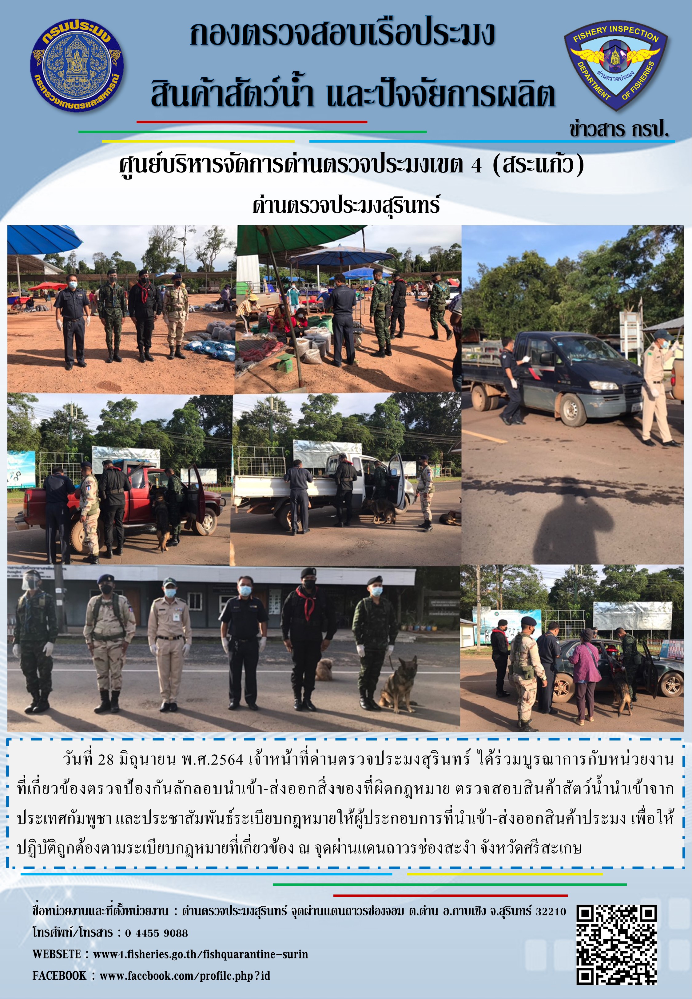 วันที่ 28 มิถุนายน พ.ศ.2564 เจ้าหน้าที่ด่านตรวจประมงสุรินทร์ ได้ร่วมบูรณาการกับหน่วยงานที่เกี่ยวข้องตรวจป้องกันลักลอบนำเข้า-ส่งออกสิ่งของที่ผิดกฎหมาย ตรวจสอบสินค้าสัตว์น้ำนำเข้าจาก ประเทศกัมพูชา และประชาสัมพันธ์ระเบียบกฎหมายให้ผู้ประกอบการที่นำเข้า-ส่งออกสินค้าประมง เพื่อให้ปฏิบัติถูกต้องตามระเบียบกฎหมายที่เกี่ยวข้อง ณ จุดผ่านแดนถาวรช่องสะงำ จังหวัดศรีสะเกษ