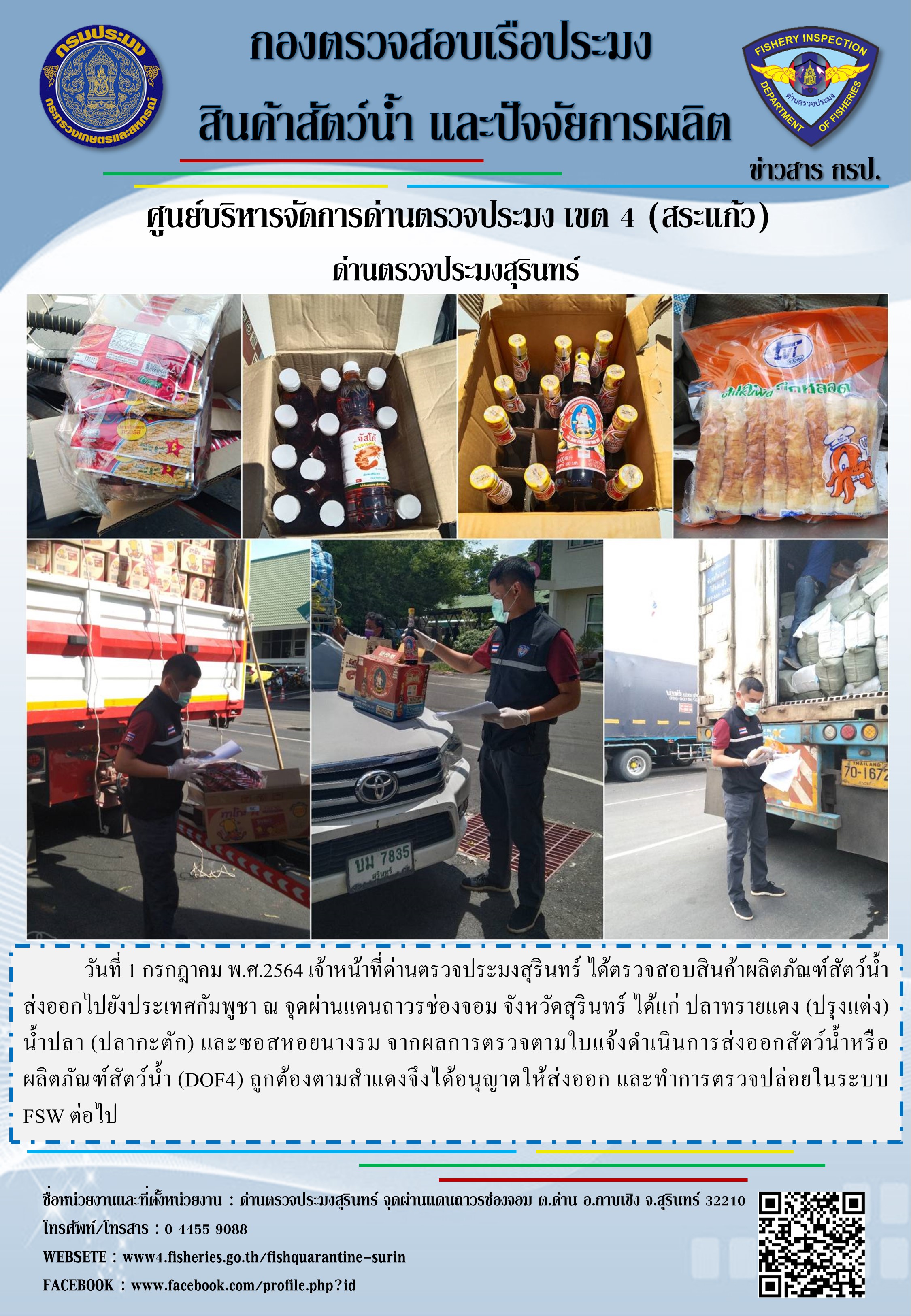 วันที่ 1 กรกฎาคม พ.ศ.2564 เจ้าหน้าที่ด่านตรวจประมงสุรินทร์ ได้ตรวจสอบสินค้าผลิตภัณฑ์สัตว์น้ำ ส่งออกไปยังประเทศกัมพูชา ณ จุดผ่านแดนถาวรช่องจอม จังหวัดสุรินทร์ ได้แก่ ปลาทรายแดง (ปรุงแต่ง) น้ำปลา (ปลากะตัก) และซอสหอยนางรม จากผลการตรวจตามใบแจ้งดำเนินการส่งออกสัตว์น้ำหรือผลิตภัณฑ์สัตว์น้ำ (DOF4) ถูกต้องตามสำแดงจึงได้อนุญาตให้ส่งออก และทำการตรวจปล่อยในระบบ FSW ต่อไป
