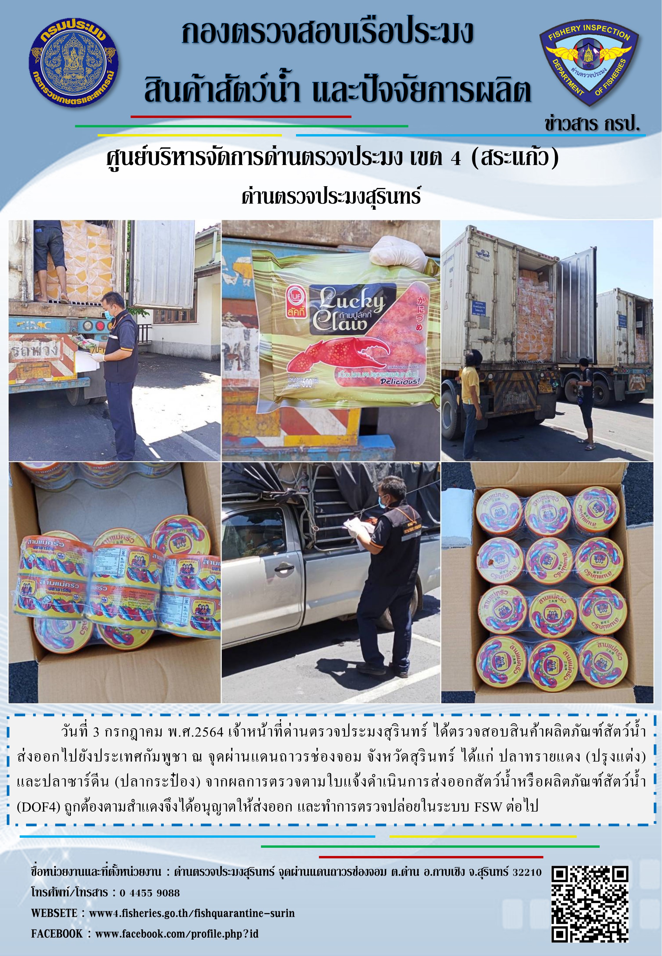 วันที่ 3 กรกฎาคม พ.ศ.2564 เจ้าหน้าที่ด่านตรวจประมงสุรินทร์ ได้ตรวจสอบสินค้าผลิตภัณฑ์สัตว์น้ำ ส่งออกไปยังประเทศกัมพูชา ณ จุดผ่านแดนถาวรช่องจอม จังหวัดสุรินทร์ ได้แก่ ปลาทรายแดง (ปรุงแต่ง) และปลาซาร์ดีน (ปลากระป๋อง) จากผลการตรวจตามใบแจ้งดำเนินการส่งออกสัตว์น้ำหรือผลิตภัณฑ์สัตว์น้ำ (DOF4) ถูกต้องตามสำแดงจึงได้อนุญาตให้ส่งออก และทำการตรวจปล่อยในระบบ FSW ต่อไป