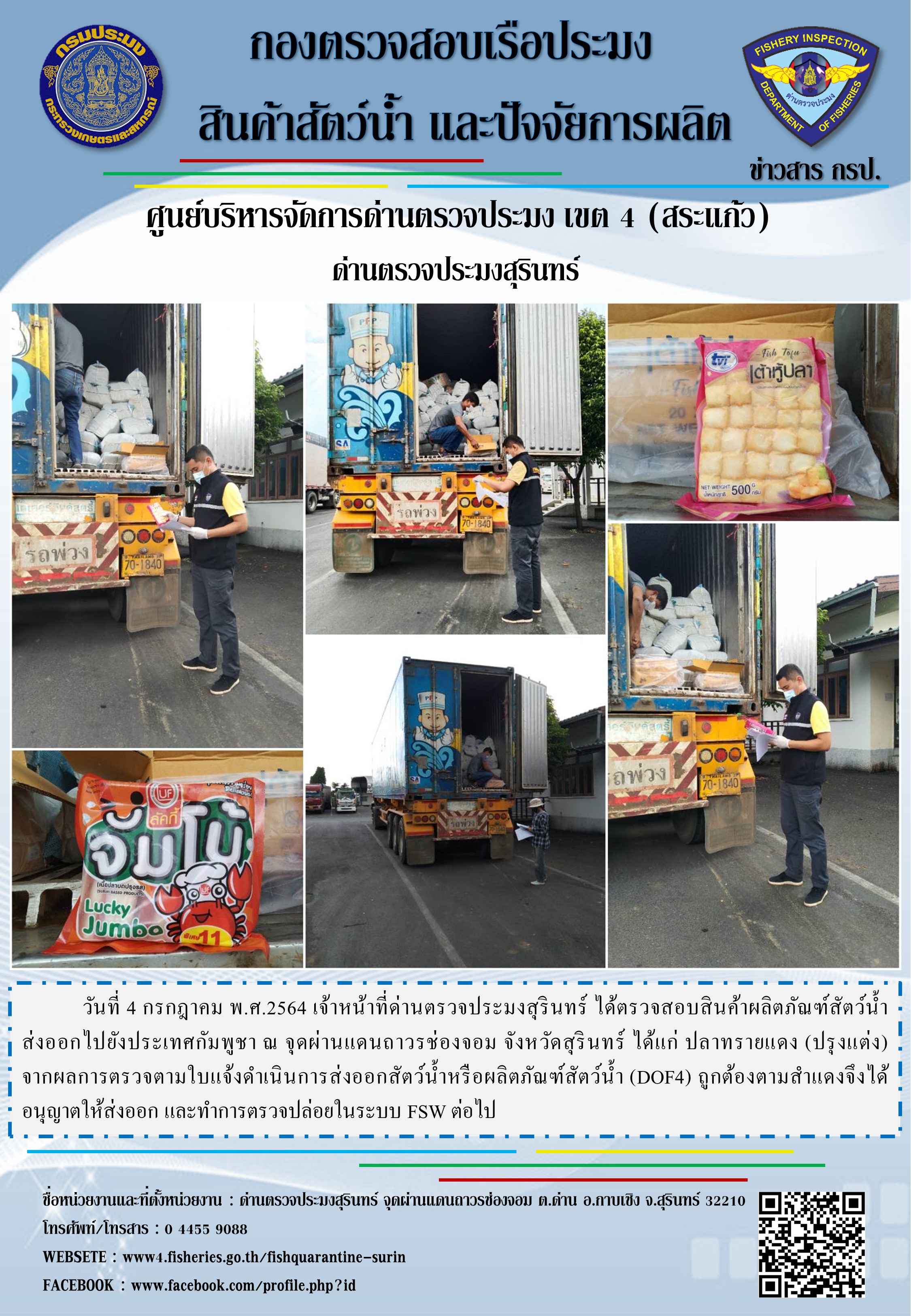 วันที่ 4 กรกฎาคม พ.ศ.2564 เจ้าหน้าที่ด่านตรวจประมงสุรินทร์ ได้ตรวจสอบสินค้าผลิตภัณฑ์สัตว์น้ำ ส่งออกไปยังประเทศกัมพูชา ณ จุดผ่านแดนถาวรช่องจอม จังหวัดสุรินทร์ ได้แก่ ปลาทรายแดง (ปรุงแต่ง) จากผลการตรวจตามใบแจ้งดำเนินการส่งออกสัตว์น้ำหรือผลิตภัณฑ์สัตว์น้ำ (DOF4) ถูกต้องตามสำแดงจึงได้อนุญาตให้ส่งออก และทำการตรวจปล่อยในระบบ FSW ต่อไป