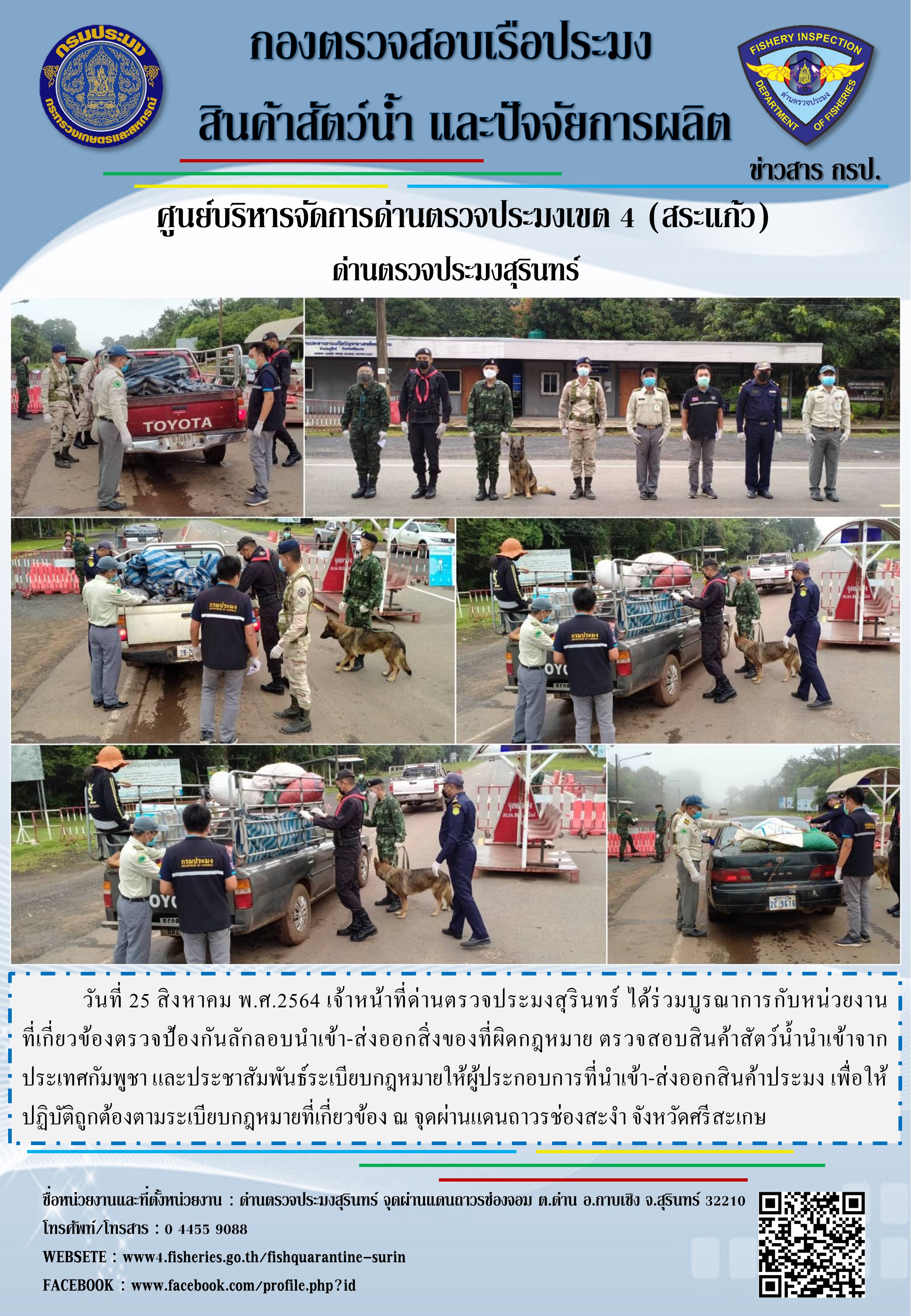 วันที่ 25 สิงหาคม พ.ศ.2564 เจ้าหน้าที่ด่านตรวจประมงสุรินทร์ ได้ร่วมบูรณาการกับหน่วยงานที่เกี่ยวข้องตรวจป้องกันลักลอบนำเข้า-ส่งออกสิ่งของที่ผิดกฎหมาย ตรวจสอบสินค้าสัตว์น้ำนำเข้าจากประเทศกัมพูชา และประชาสัมพันธ์ระเบียบกฎหมายให้ผู้ประกอบการที่นำเข้า-ส่งออกสินค้าประมง เพื่อให้ปฏิบัติถูกต้องตามระเบียบกฎหมายที่เกี่ยวข้อง ณ จุดผ่านแดนถาวรช่องสะงำ จังหวัดศรีสะเกษ