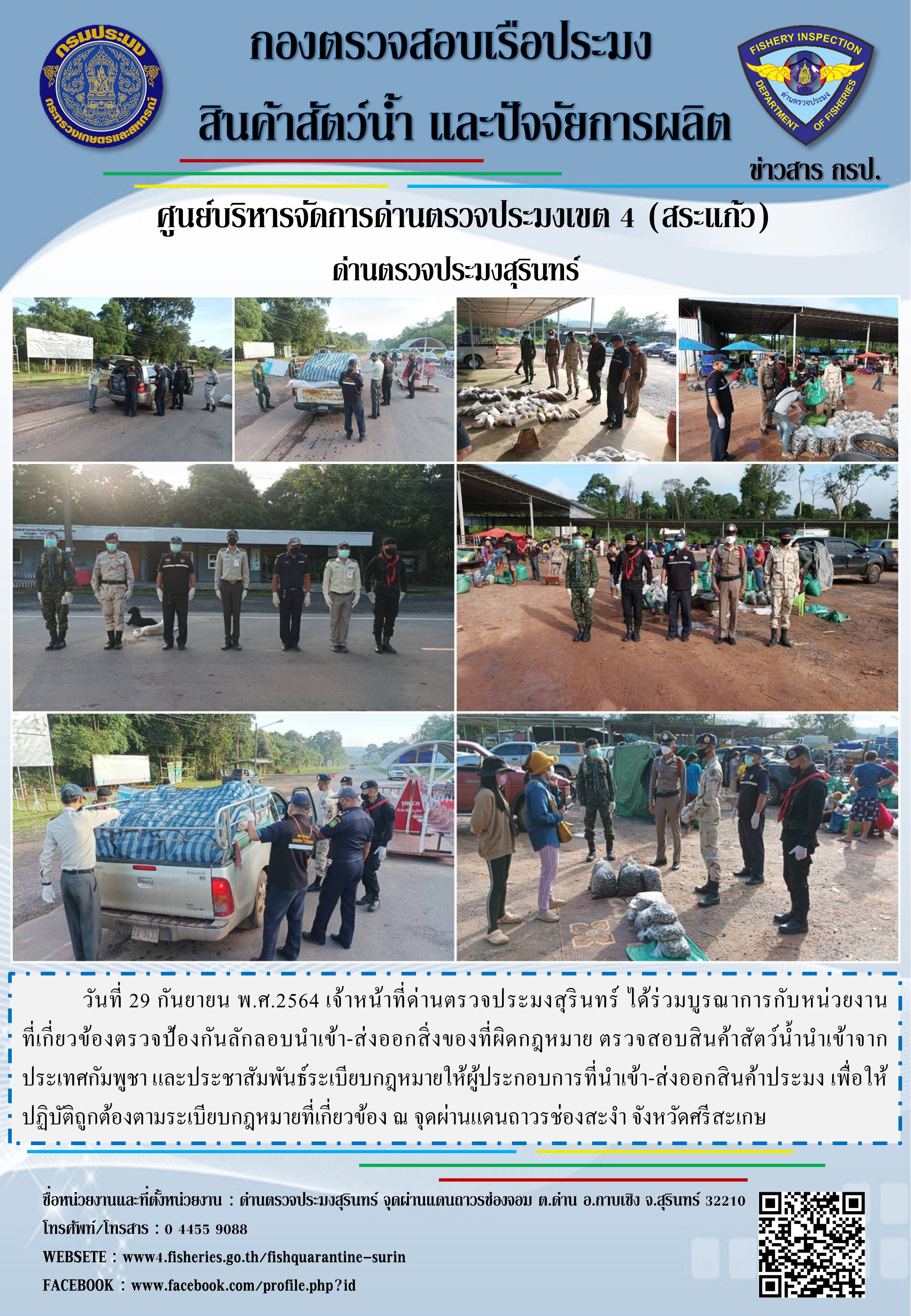 วันที่ 29 กันยายน พ.ศ.2564 เจ้าหน้าที่ด่านตรวจประมงสุรินทร์ ได้ร่วมบูรณาการกับหน่วยงานที่เกี่ยวข้องตรวจป้องกันลักลอบนำเข้า-ส่งออกสิ่งของที่ผิดกฎหมาย ตรวจสอบสินค้าสัตว์น้ำนำเข้าจากประเทศกัมพูชา และประชาสัมพันธ์ระเบียบกฎหมายให้ผู้ประกอบการที่นำเข้า-ส่งออกสินค้าประมง เพื่อให้ปฏิบัติถูกต้องตามระเบียบกฎหมายที่เกี่ยวข้อง ณ จุดผ่านแดนถาวรช่องสะงำ จังหวัดศรีสะเกษ